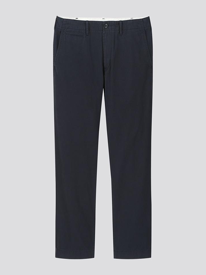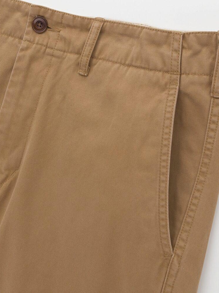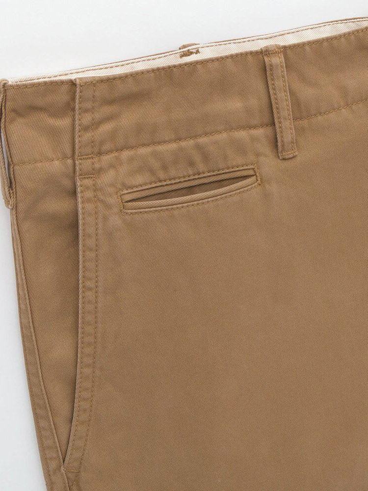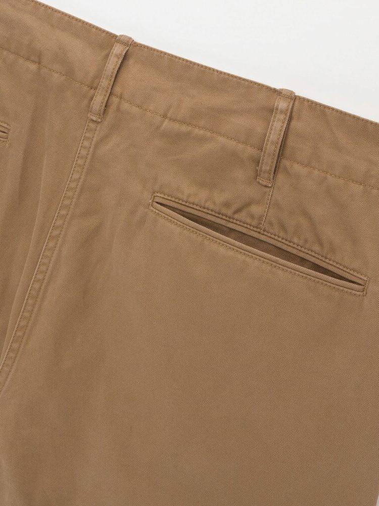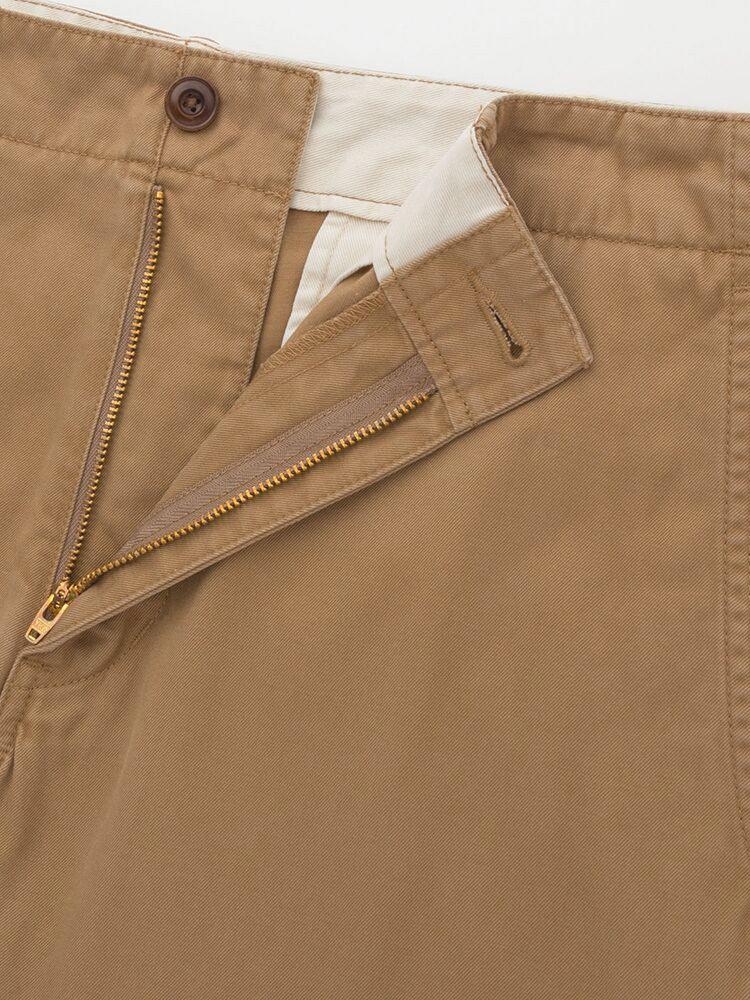 腰带环的宽度、前襟等细节考究,展现了传统卡其裤的设计风格。采用棉质斜纹面料制成。
