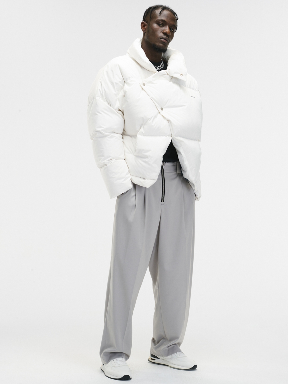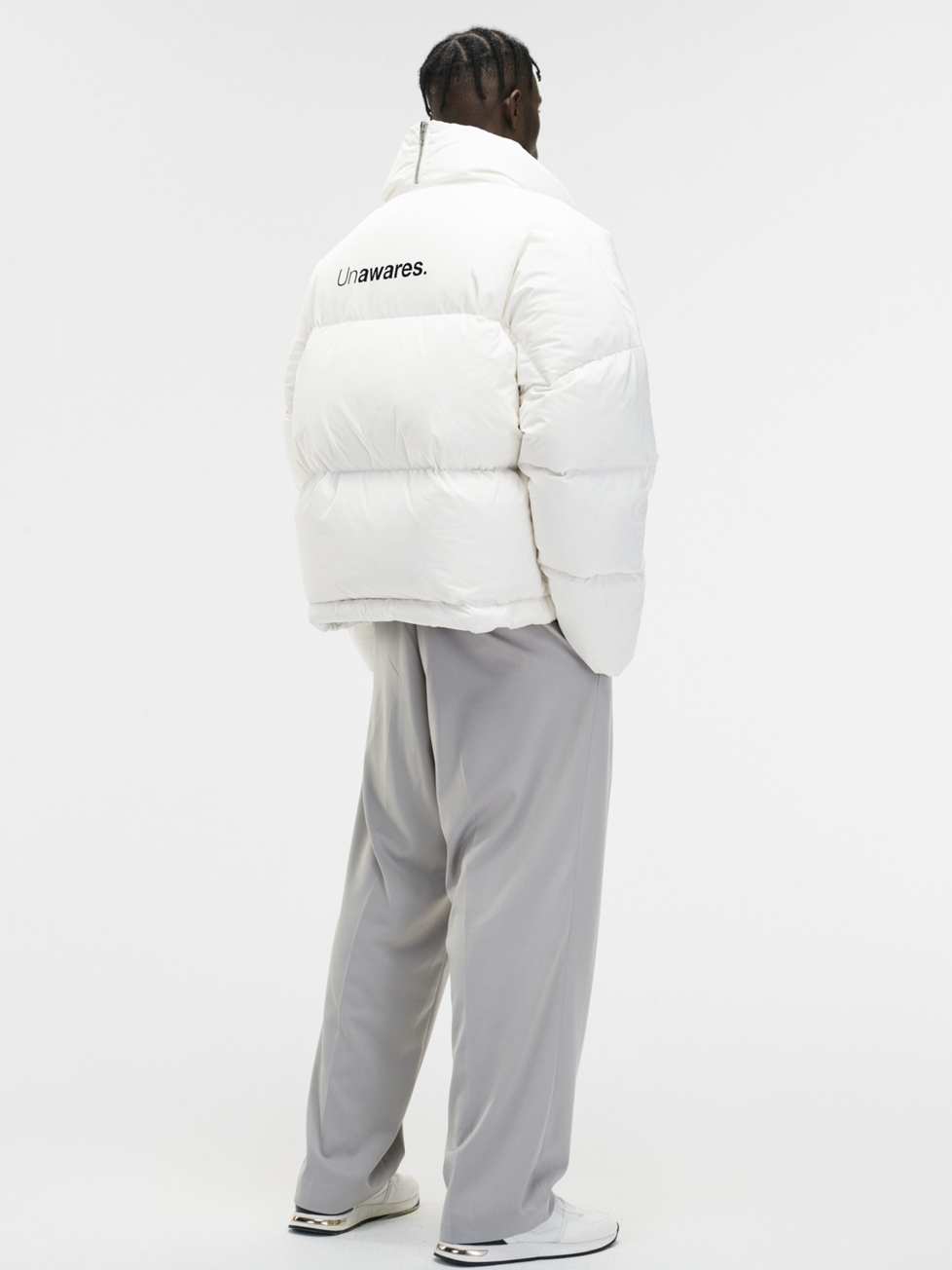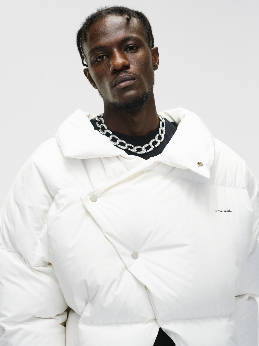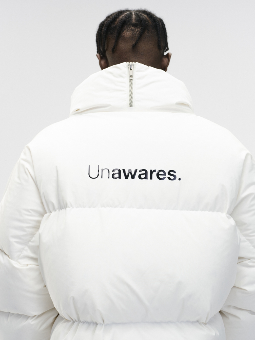 Unawares.推出重磅“面包羽绒服”,在保暖的前提下,革新羽绒服版型做法,下摆开叉配合前幅四合扣的做法,呈现出不规则开叉结构,更加凸显腰线及下身比例。