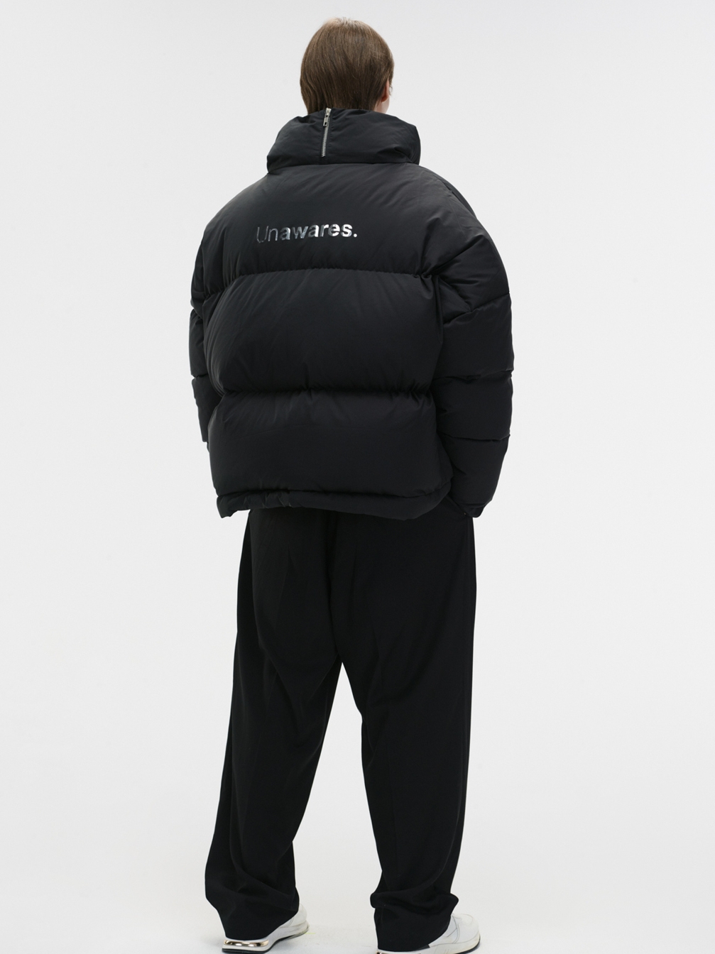 后背Unawares.品牌热转印LOGO,搭配后领的金属拉链,相得益彰。最大1000G的充绒量,抗寒度MAX,更加让整件单品呈现出饱满的蓬松度。