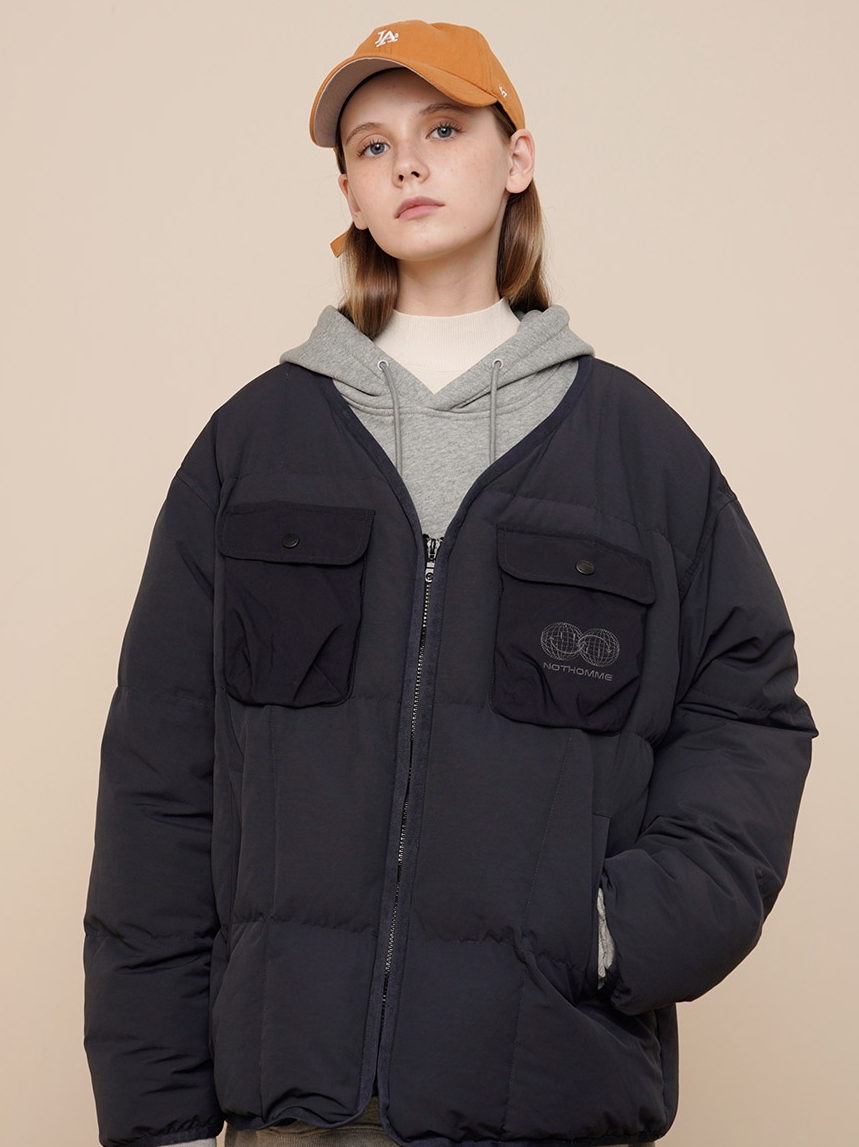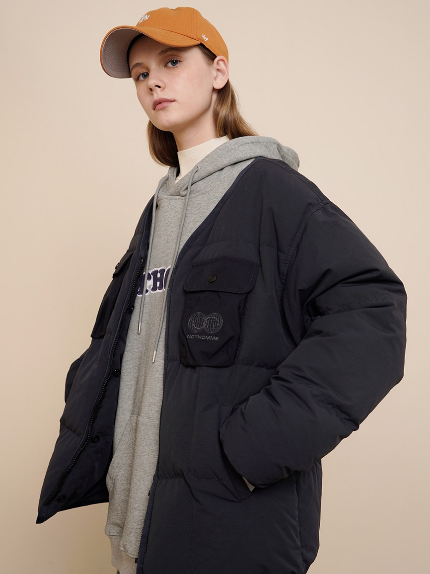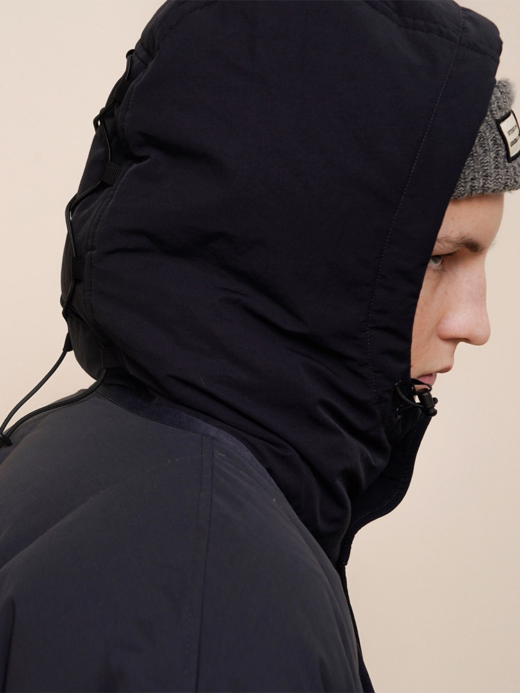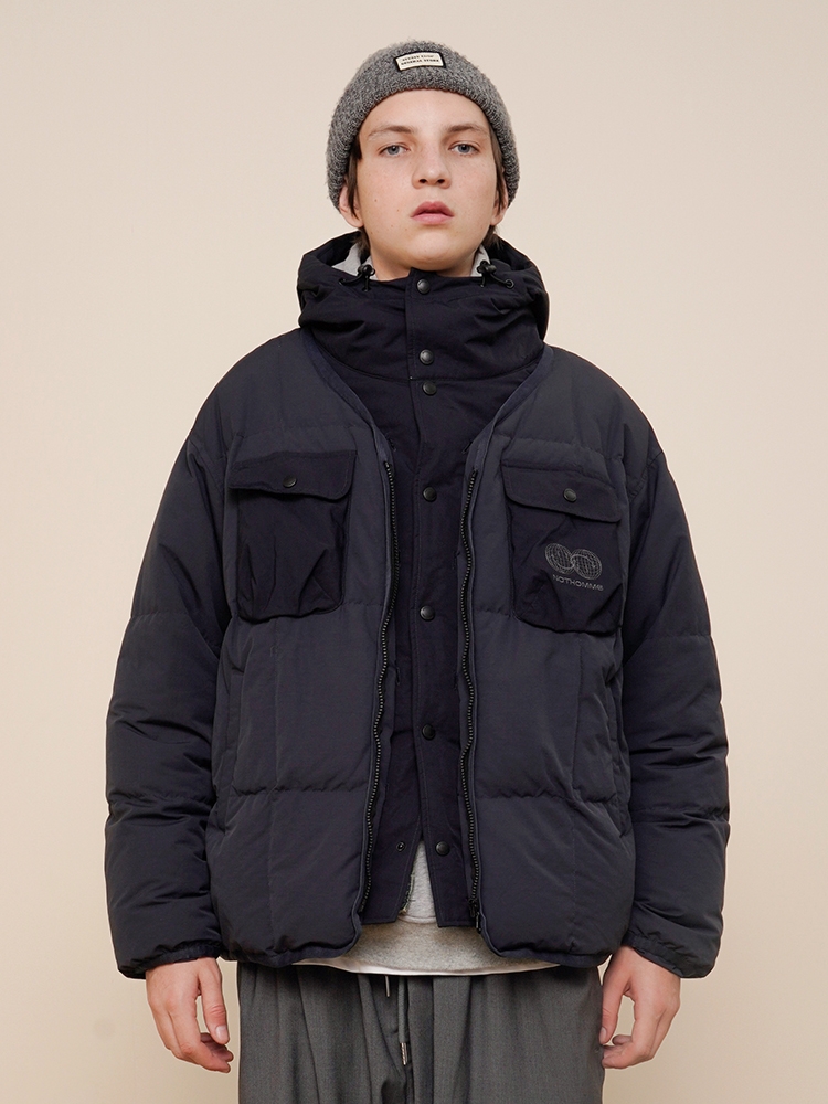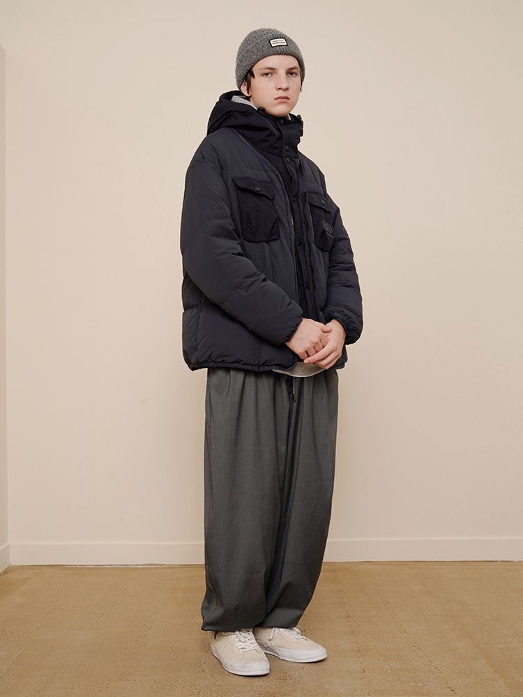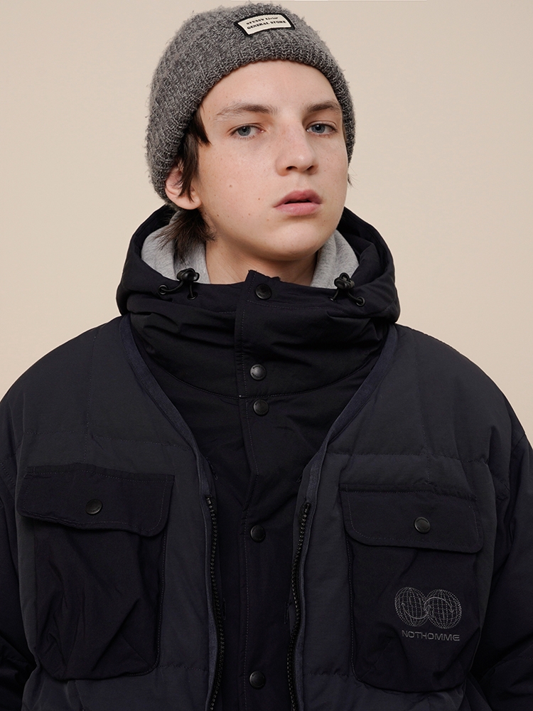 作为少有的可拆卸式两穿羽绒服,这款是设计师个人十分喜欢的一个款式。拆卸形式是用了纽扣的方式也比较方便,帽子留着的状态是一件连帽羽绒服,帽子拆掉了是一件无领的基础羽绒服,可以满足多种穿搭方式。