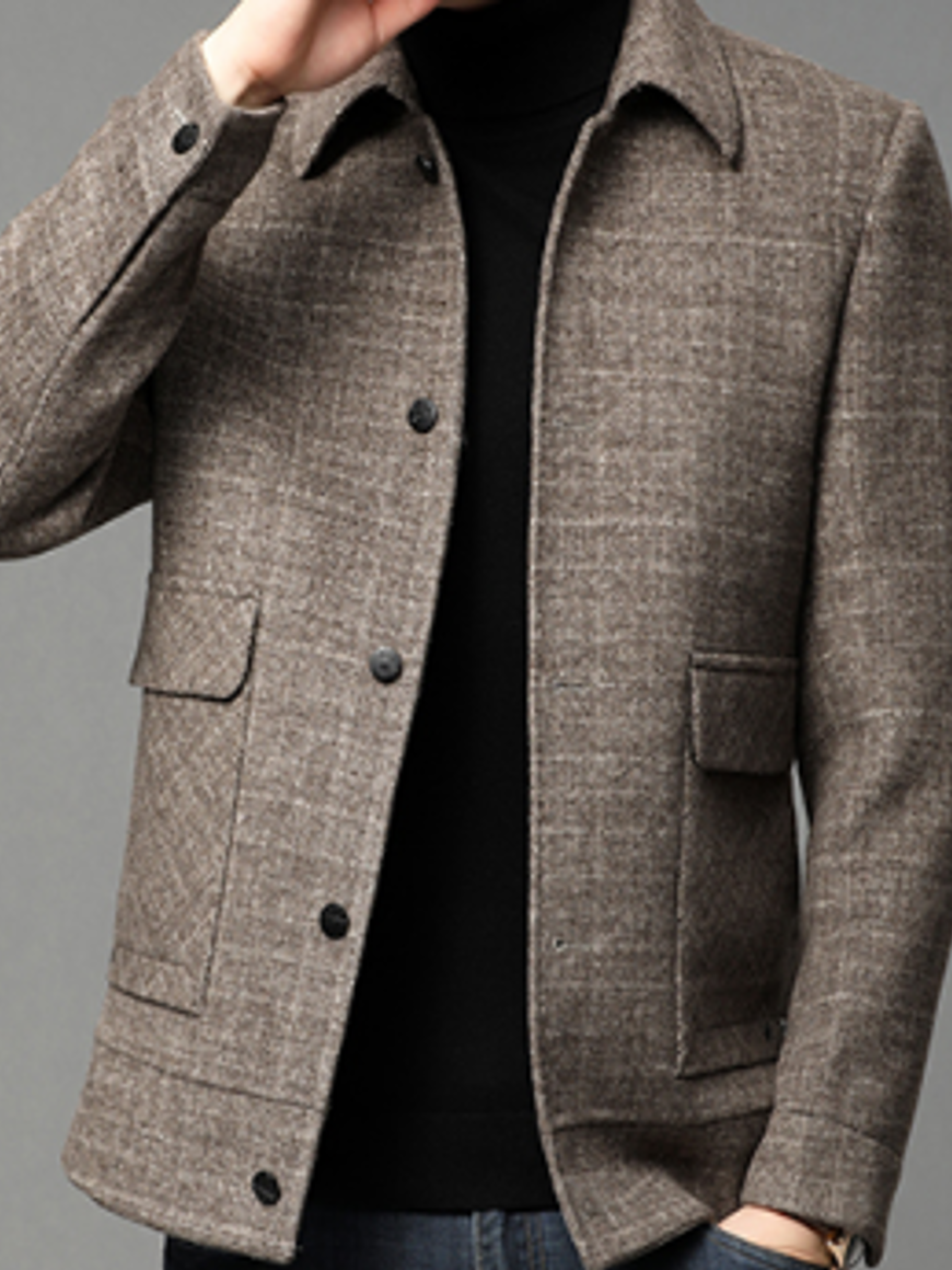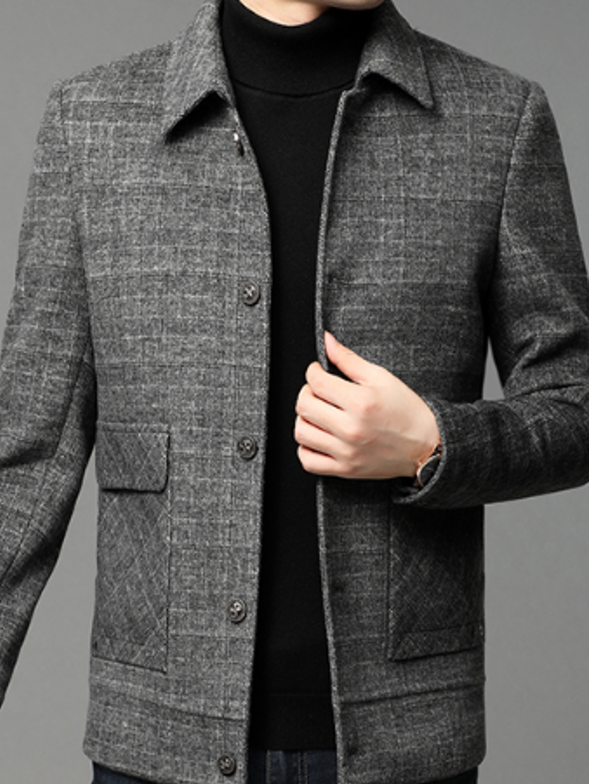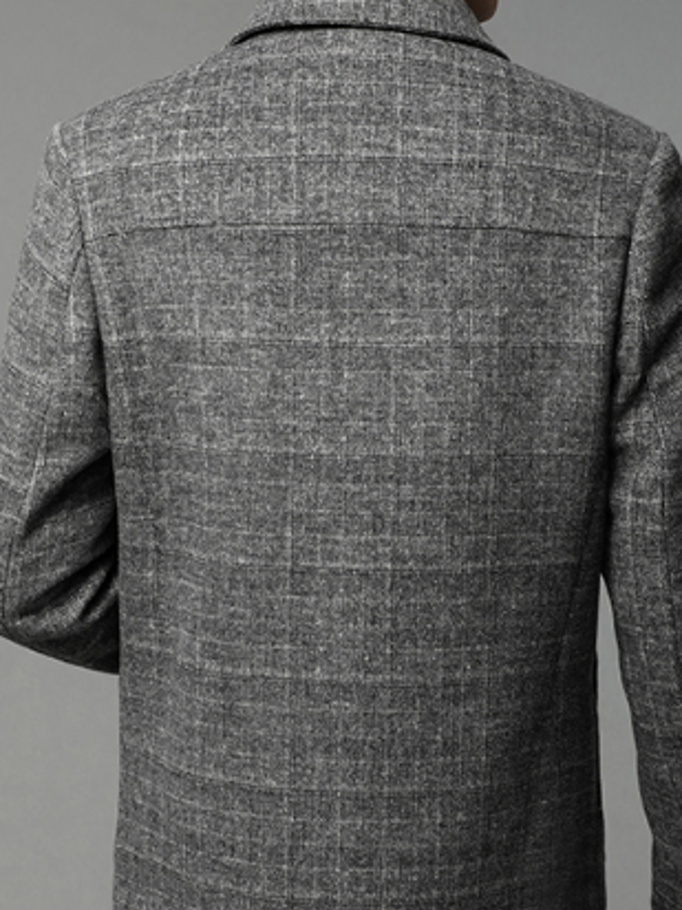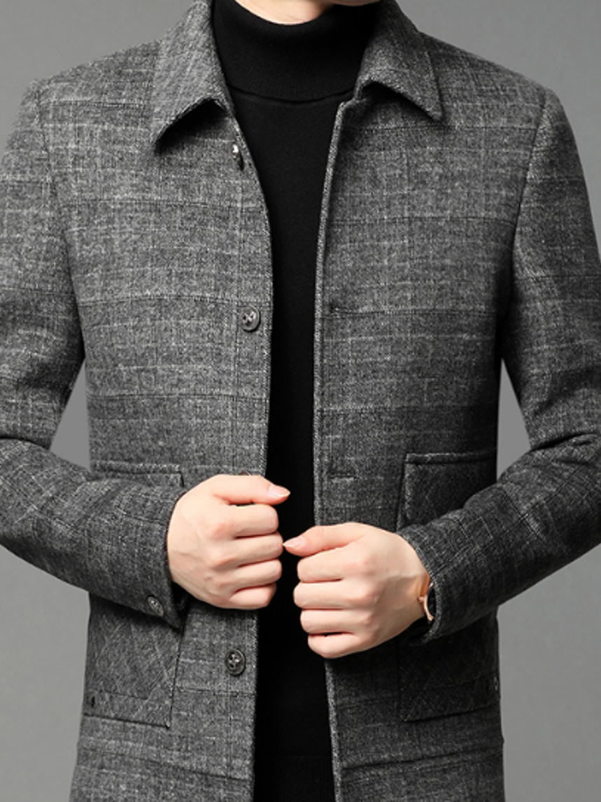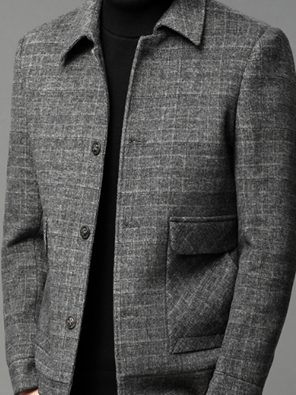 翻领设计和格纹拼接,更有一股时尚气息。单排纽扣和口袋点缀,在商务场合也能完美展现。