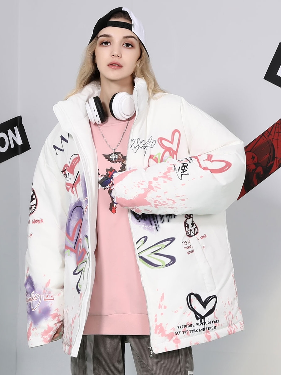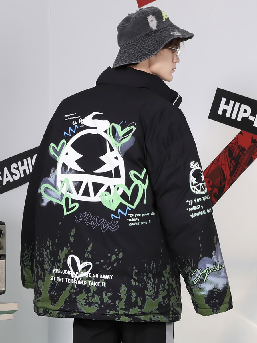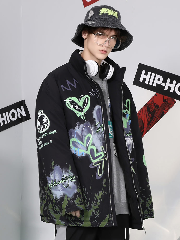 采用低调的纯色系为主色调的立领棉服,充满更显的涂鸦印花满印点缀,带来丰富的视觉效果,展现街头美式潮流格调。结合拉链闭合的设计,方便日常穿脱。
