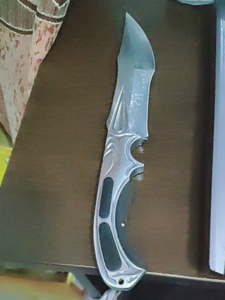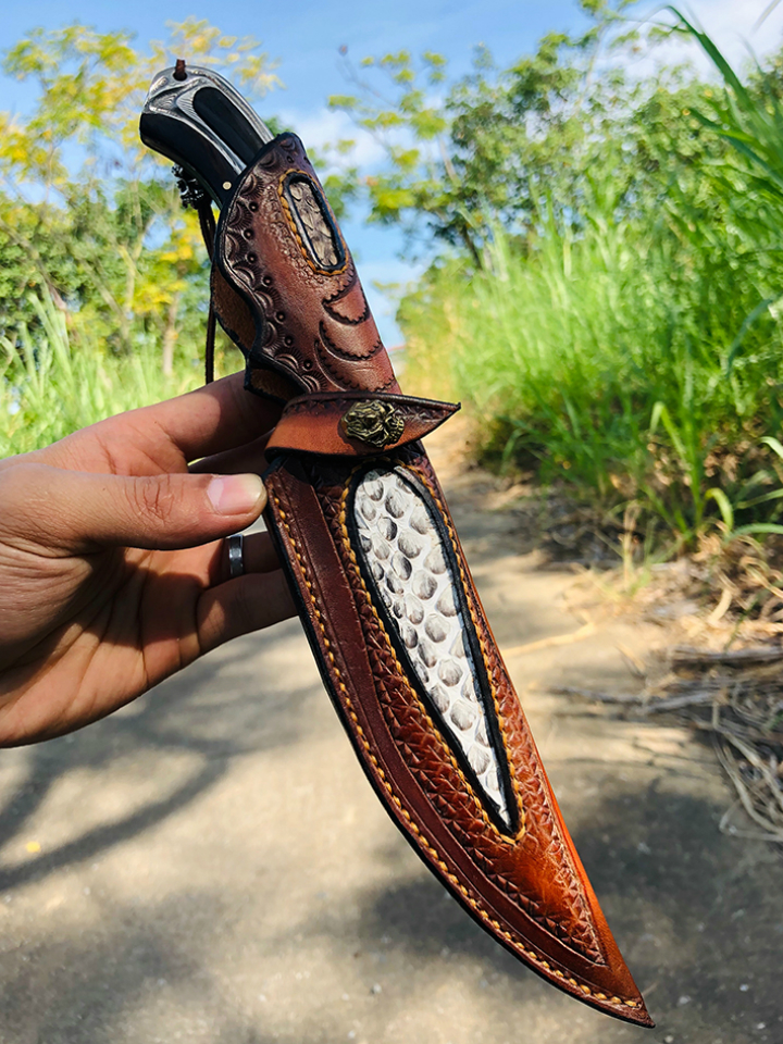 这款玲珑师的大马士革折叠锻打钢刀,十分精美,刀柄骆驼骨线条适用于手部姿势,加上雕花双铜头,彰显品质,配皮革刀鞘更好的保护小刀,不意外划伤。