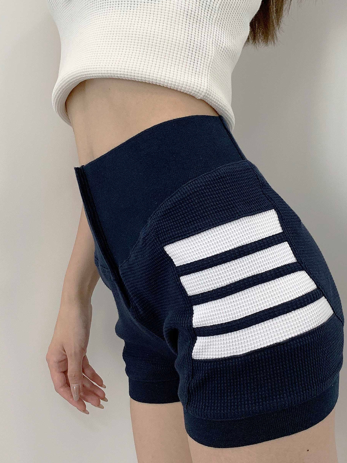 这款高腰热裤很有欧美街头风哦,毛边设计,不但时尚休闲而且还能修饰腿型呢,侧边的三条杠设计,很有特点,潮女必备单品。