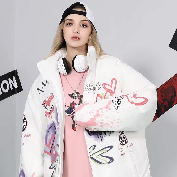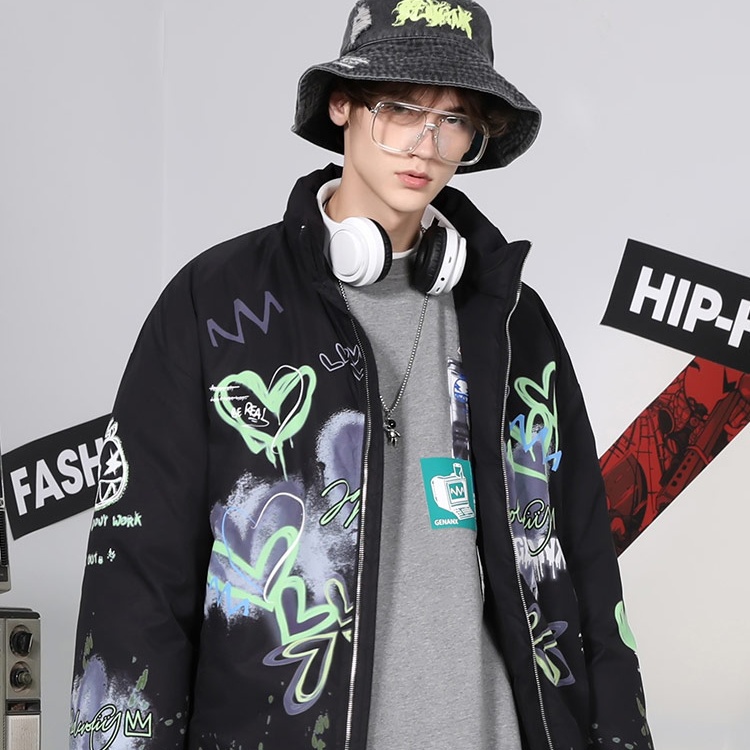艺术家联名系列的棉服,选择了爱心墙手绘主题的设计,通过融入了大面积的印花点缀,丰富了视觉观感,非对称的设计更加诠释了自由的街头文化,且本身的闪电侠象征了国潮品牌,休闲中提升了辨识度。