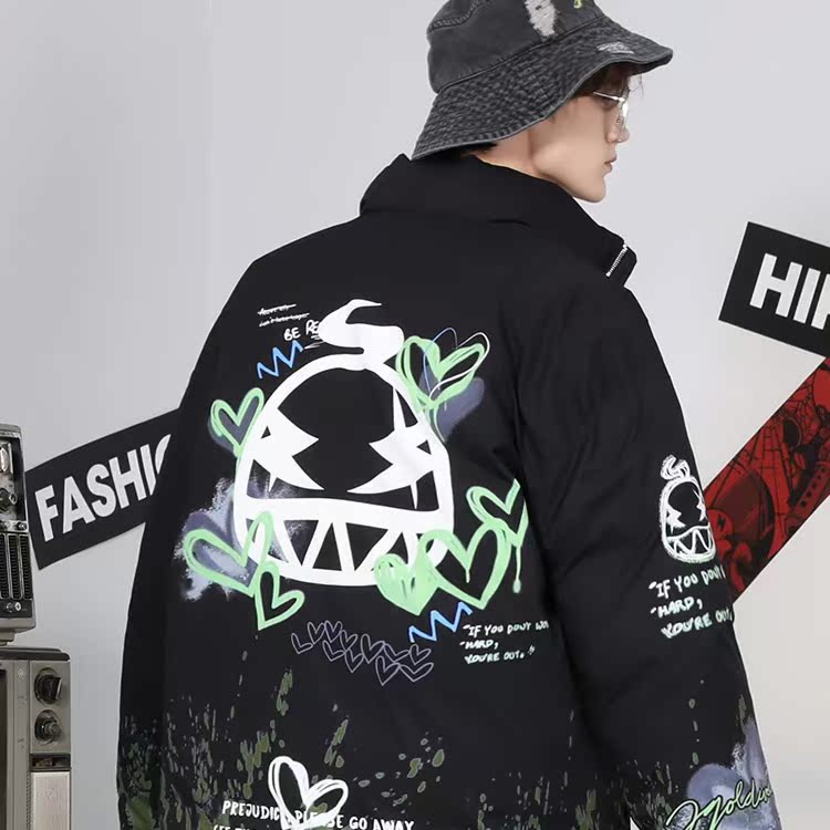 前后手绘的闪电侠图案,以卡通形象提升了品牌文化的同时,更加显得休闲帅气,立领款式硬朗有型,衬托人更加干练,且黑白配色完全适应日常的穿搭,可塑性强,作为情侣装更加显得时髦有型。