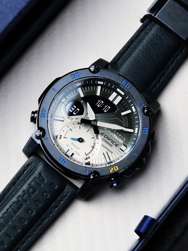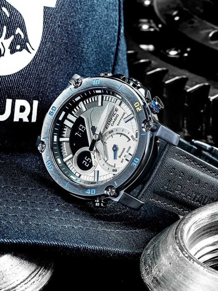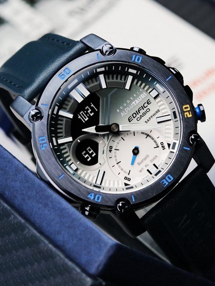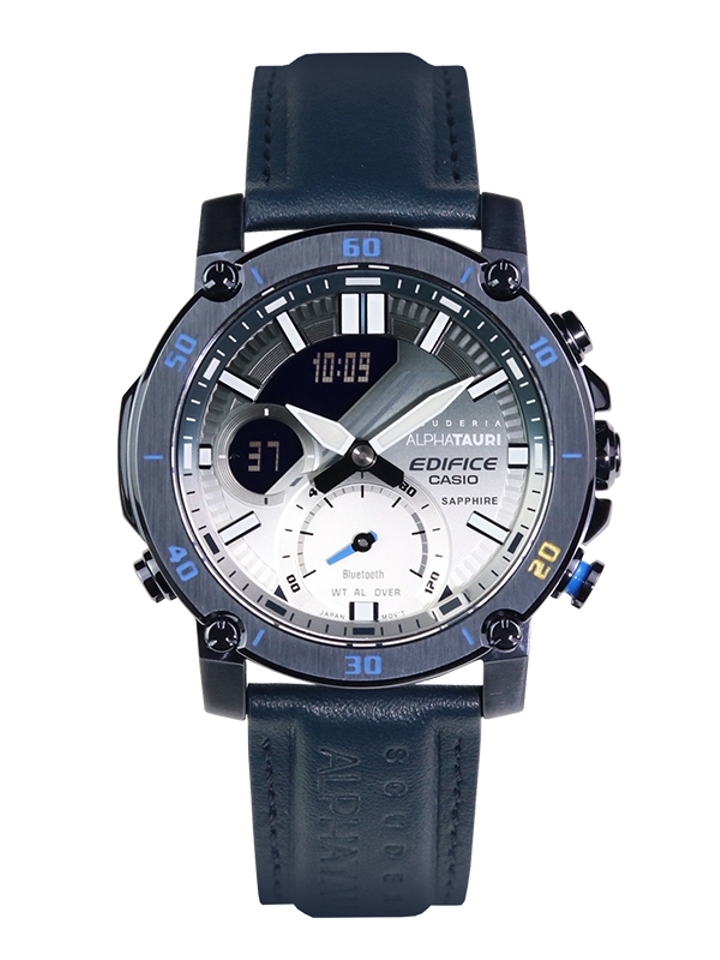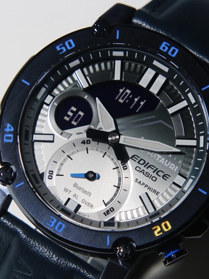 黑金风格作为灵魂,搭载太阳能,并且加入高科技蓝牙,实现手表与手机实时互动操作,连赛车用的测速计功能也融入手表中,并具备防水100米,外型利落帅气。