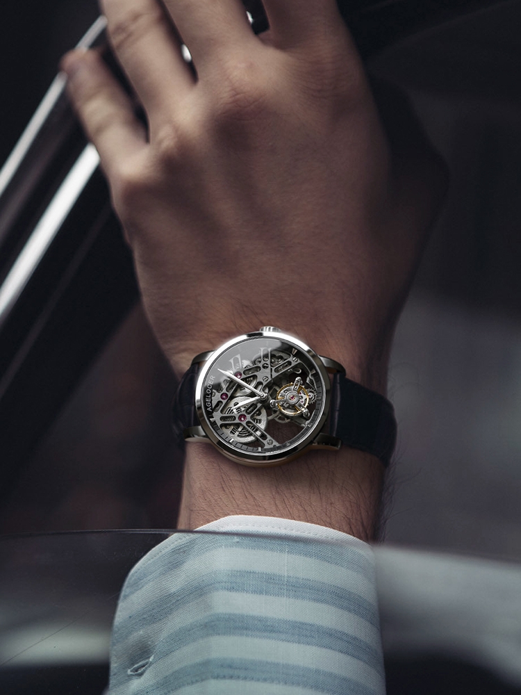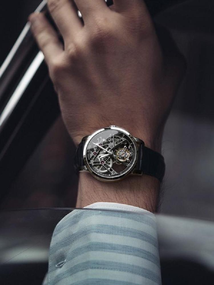 时尚腕表品牌JIUSKO,本季发布了这款尊贵系列机械表,祥云底纹字面,带来美好的祝愿,是吉祥个高升的象征。表盘点缀9颗真钻石,代替刻度,带来新颖的读时视野。6点位镂空摆陀,延续机械表的经典设计。搭配鳄鱼纹表带,舒适又不失优雅气质。