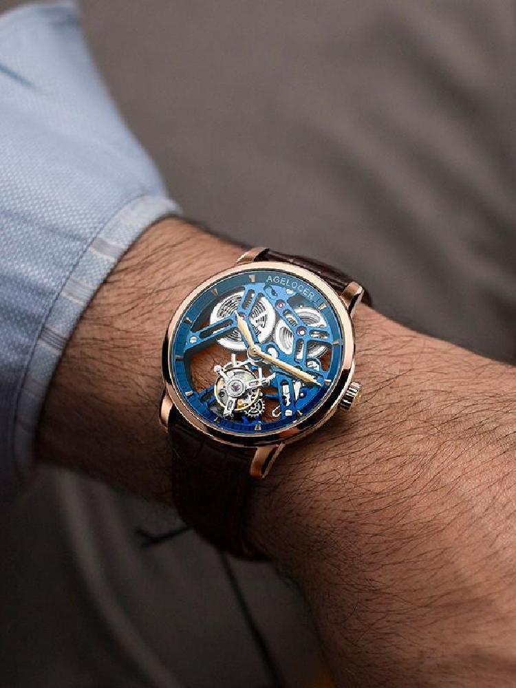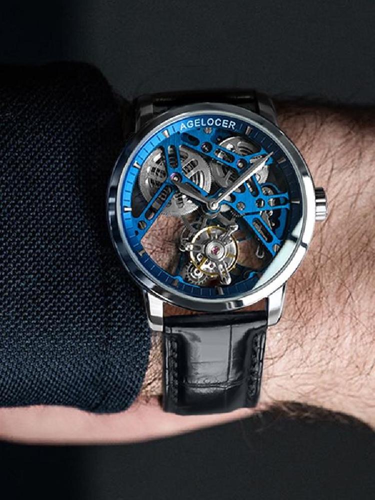 瑞夫泰格星恒系列全自动机械腕表,黑色的表盘带点晕染色彩效果,凹凸不平的质感有种深邃的气场,简单的两针计时功能简约有情调,两侧的小表盘则是动力储备指示和24小时指示,镂空的陀飞轮凸显高端尊贵品味。小牛皮的表带配备蝴蝶双按扣,佩戴简单便捷。