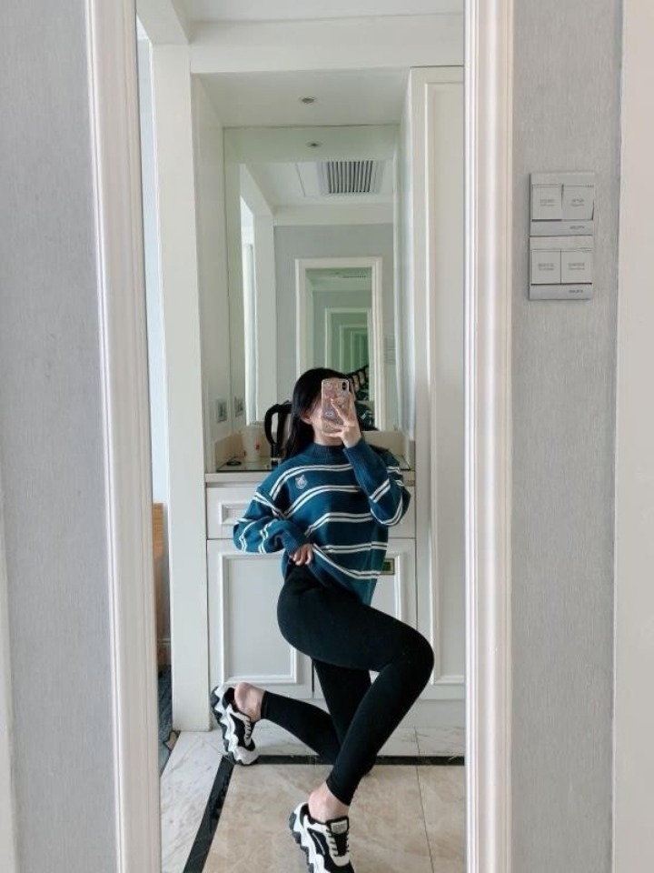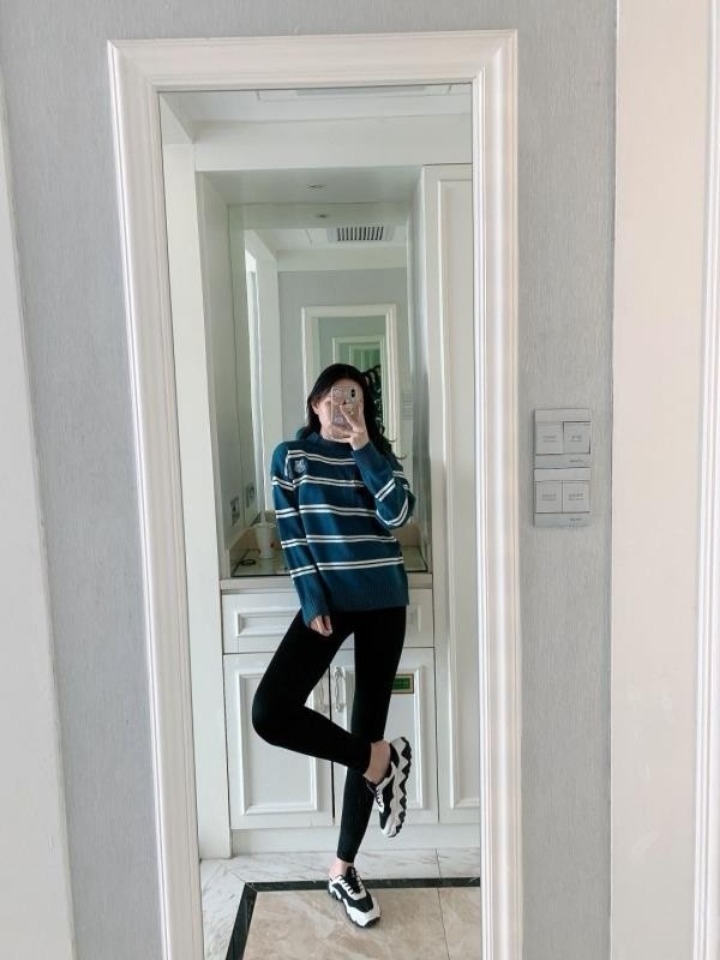 高腰的设计,拉长腿部线条,显瘦效果很好,高腰的版型,很显高挑,修身的剪裁,修饰腿部曲线,上身很有范。