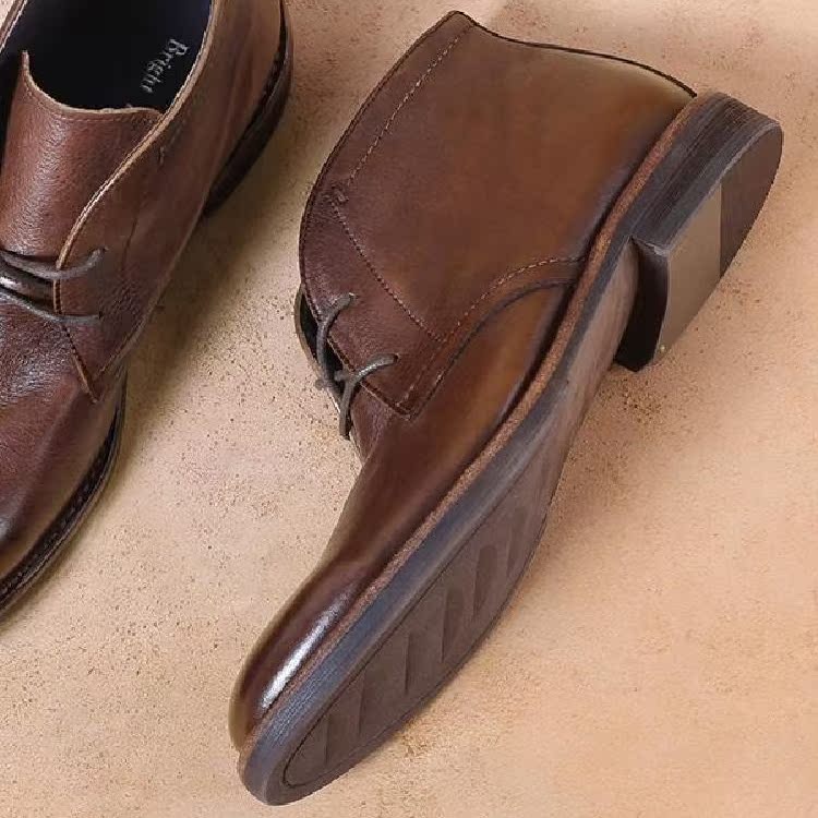 甄选进口小牛皮手感细腻,颜色效果采用原色皮胚纯手工涂染工艺,反复的润色使得颜色通透,层次毫不生硬;经打蜡抛光处理后整体皮面光泽丰润。鞋底采用软胶牛津底,脚感轻便舒适,行走无声,走线工整的手工浸蜡马克线清晰可见。
