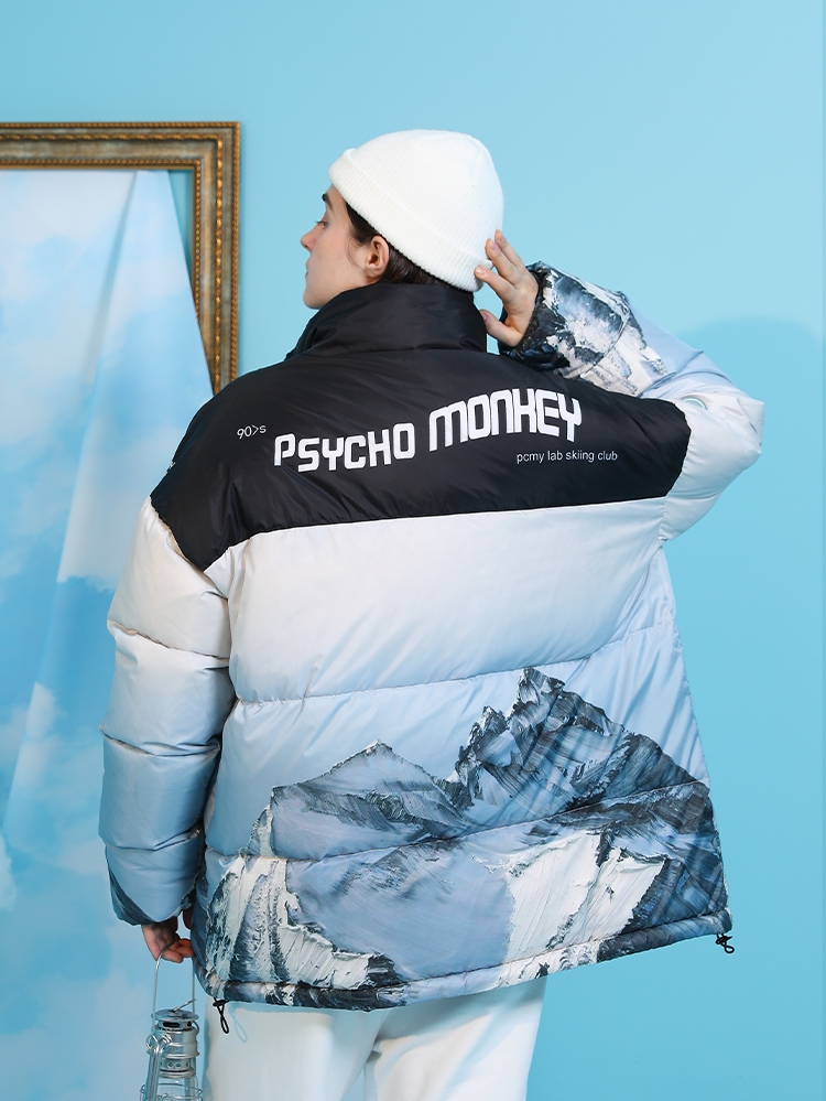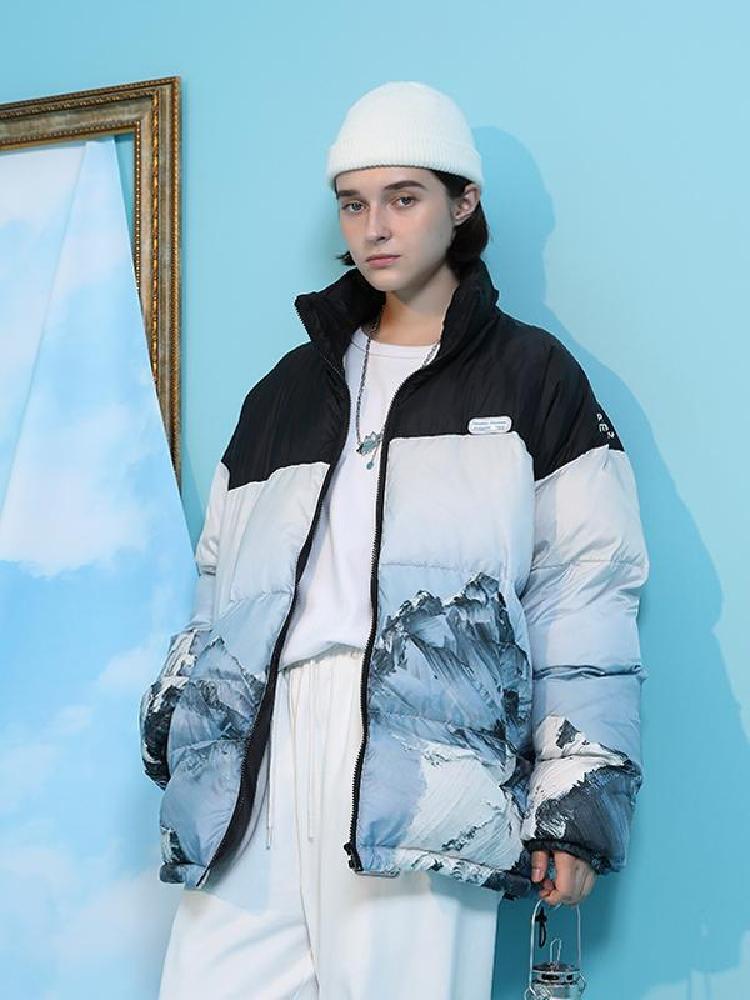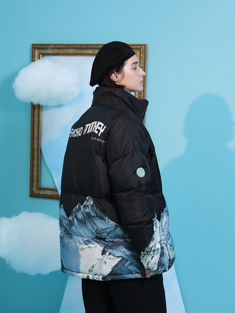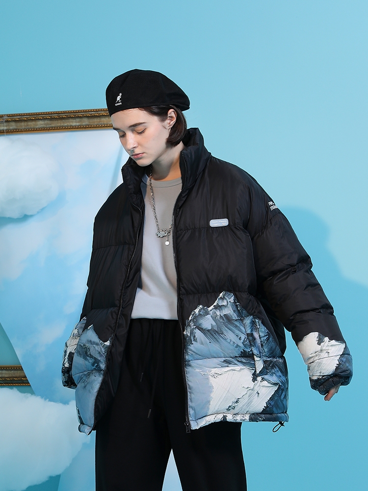 具有街头风的羽绒服,采用黑白两色设计,抢眼的印花带来视觉上撞击感。立领增加保暖效果。修身版型,中长款,遮肉显瘦。