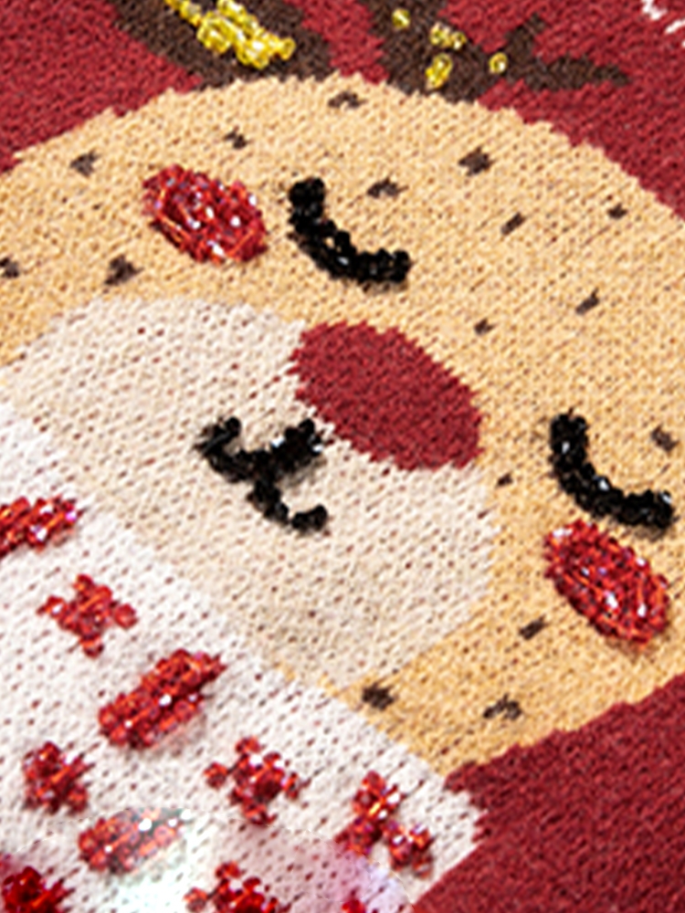 亮眼的红色是圣诞节的标配,宽松的版型让你无论怎么搭配都能完美合拍。正面超大幅的麋鹿图案,Q萌逼真,拟人的织法让它更加活泼可爱。鹿身和鹿角都用到了钉珠装饰,不同颜色的珠子让图案层次感十足。