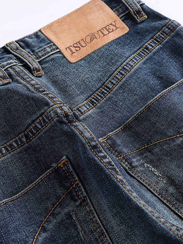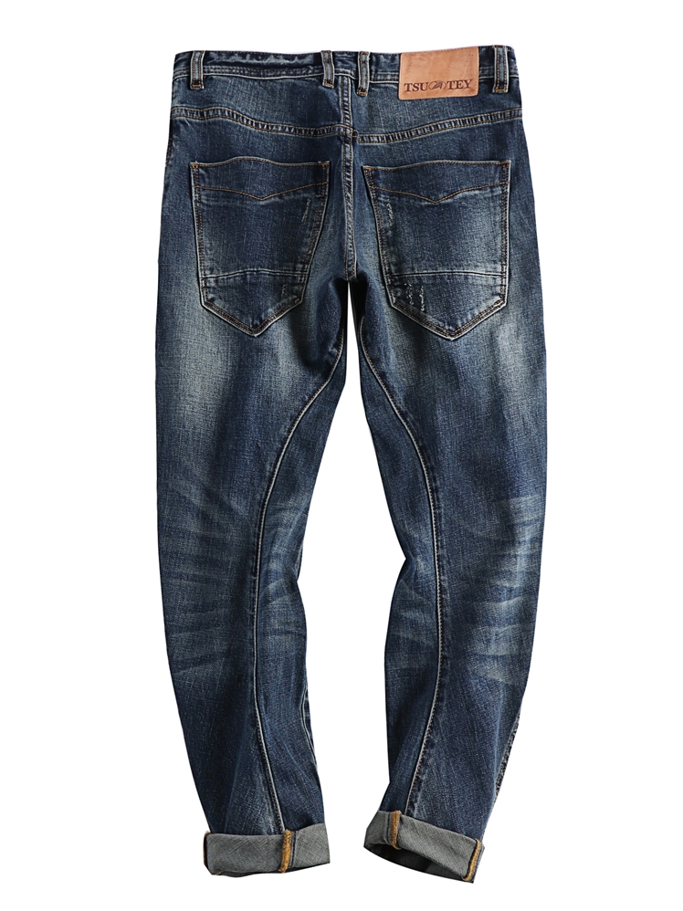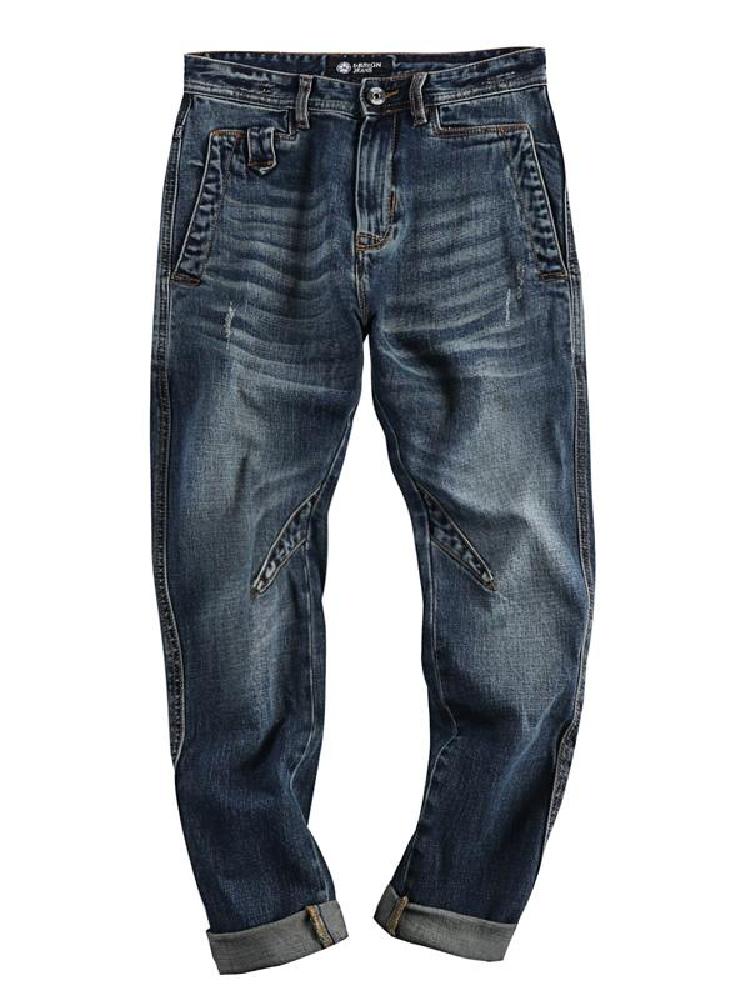 深蓝色石磨水洗的牛仔裤,版型立体剪裁带点弯刀,偏直筒一些。适合逛街或是约会穿着,展现时尚男友力,与黑色的夹克和衬衫以及帆布鞋搭配,青春时尚范爆棚。