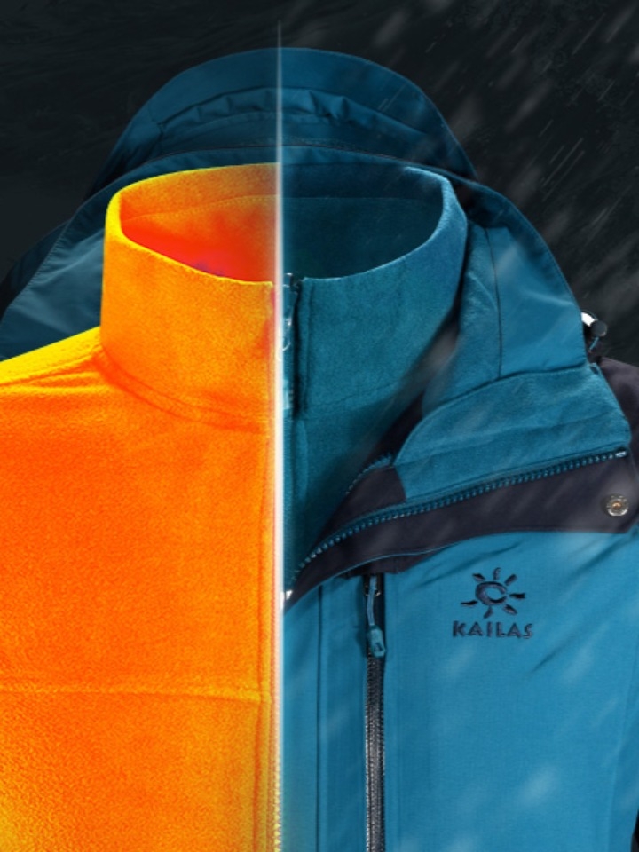 三合一冲锋衣,内胆采用聚热绒材料,手感轻盈,穿着舒适自然,领口肩部和衣袖采用抗静电的复合软壳弹力面料,在增强活动伸展性的同时可直接透气,双拼色对称线条设计,既时尚又实用。