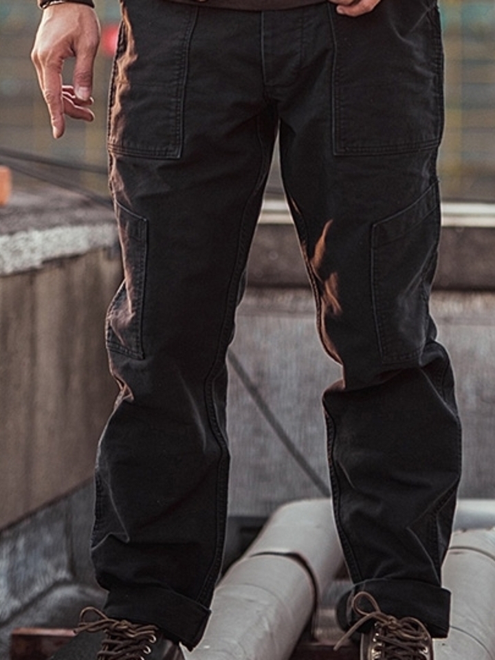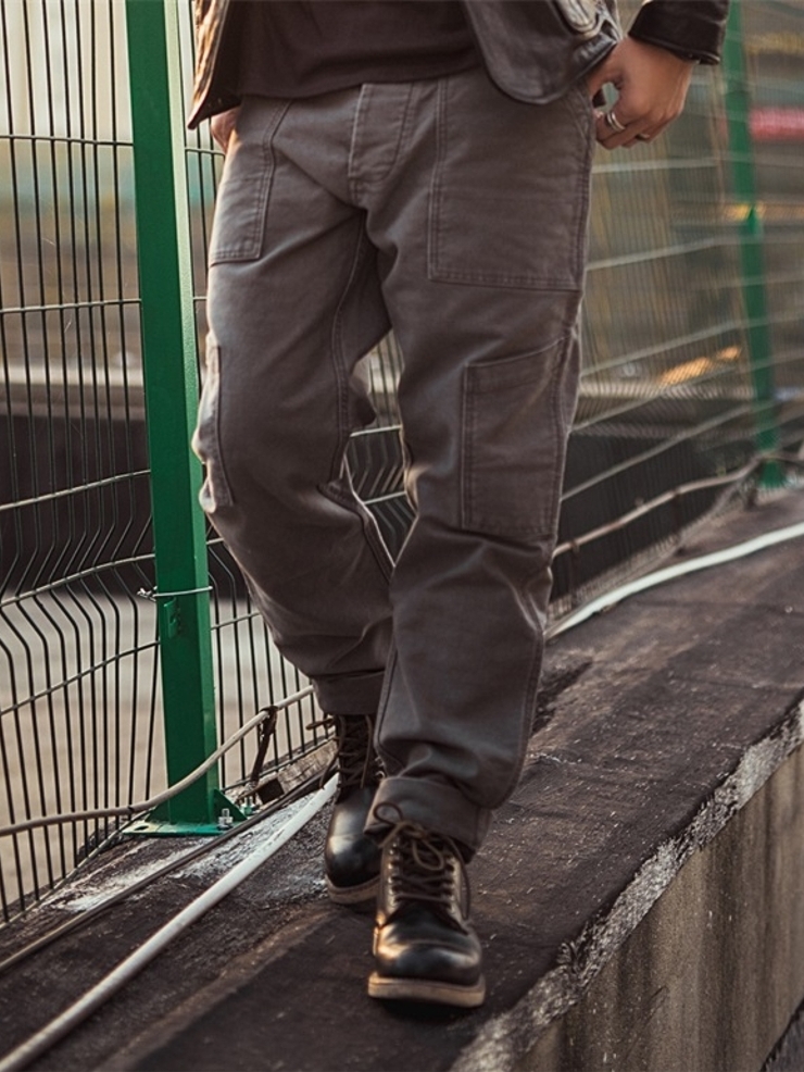 裤子整体以锥形呈现,修饰腿部线条。并且以侧面大兜配合出层次感,也比较偏向于如今的工装风格。