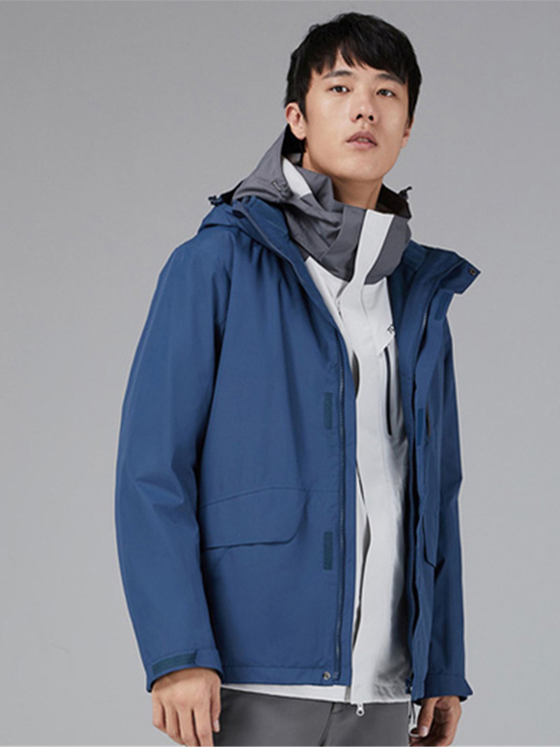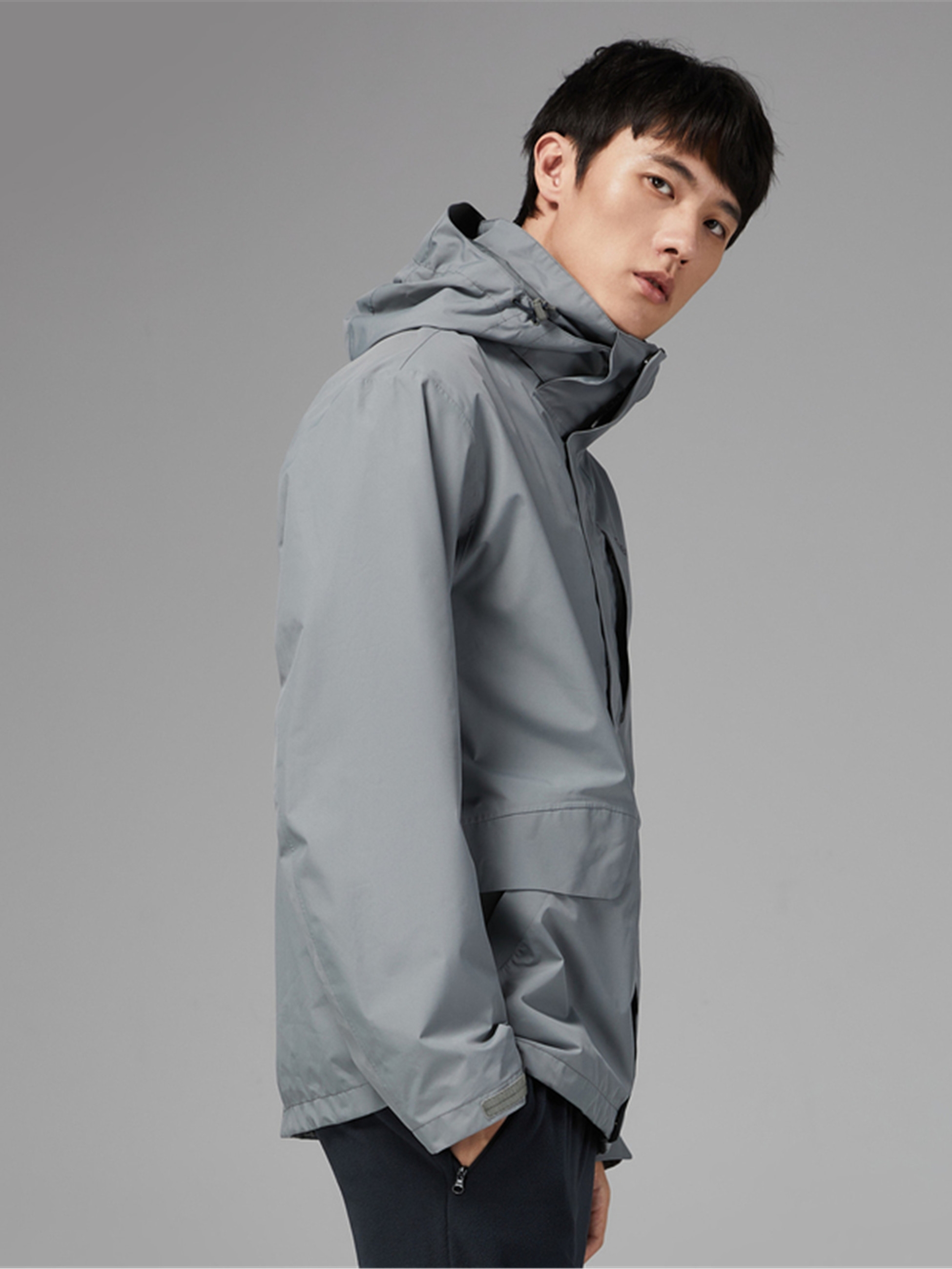采用防水、防风、透湿面料,帽子有三维调节系统,可根据头型调节高度和围度,前胸民族胶膜图案搭配拉链,更彰显专业性而且还贴近生活。配有内主项拉链,可与抓绒服、棉服、羽绒服内件套穿,本款内件为近似色搭配保暖抓绒服,二合一结构。