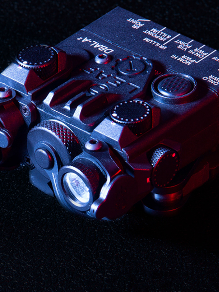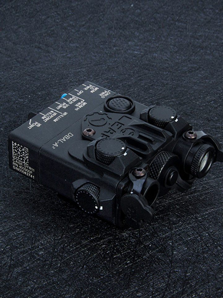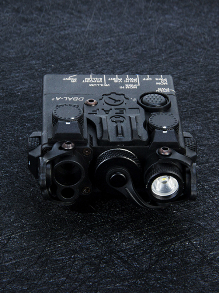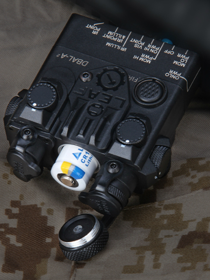PEQ这类镭射器所承担的主要战术用途是配合头戴夜视仪让枪械在夜间进行有效射击。就拿典型的PEQ2来说,如下图所示,其头部有两个发射端口,右侧较大的端口是用来发射红外照明光,左侧较小的端口用来发射红外瞄准激光。