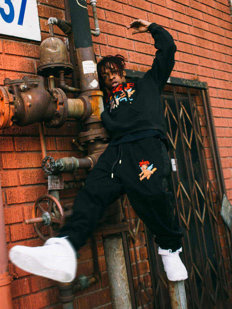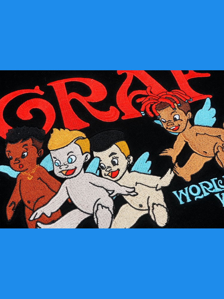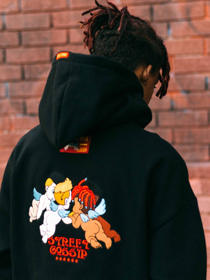 原创设计款的连帽卫衣,前后的图案相互呼应,小天使的前后背景正好可以衔接成一幅画面,且脏辫的形象多了分黑人嘻哈风格,图文创意新奇有记忆点,暗黑系更加炫酷时髦,穿出了街头气质。
