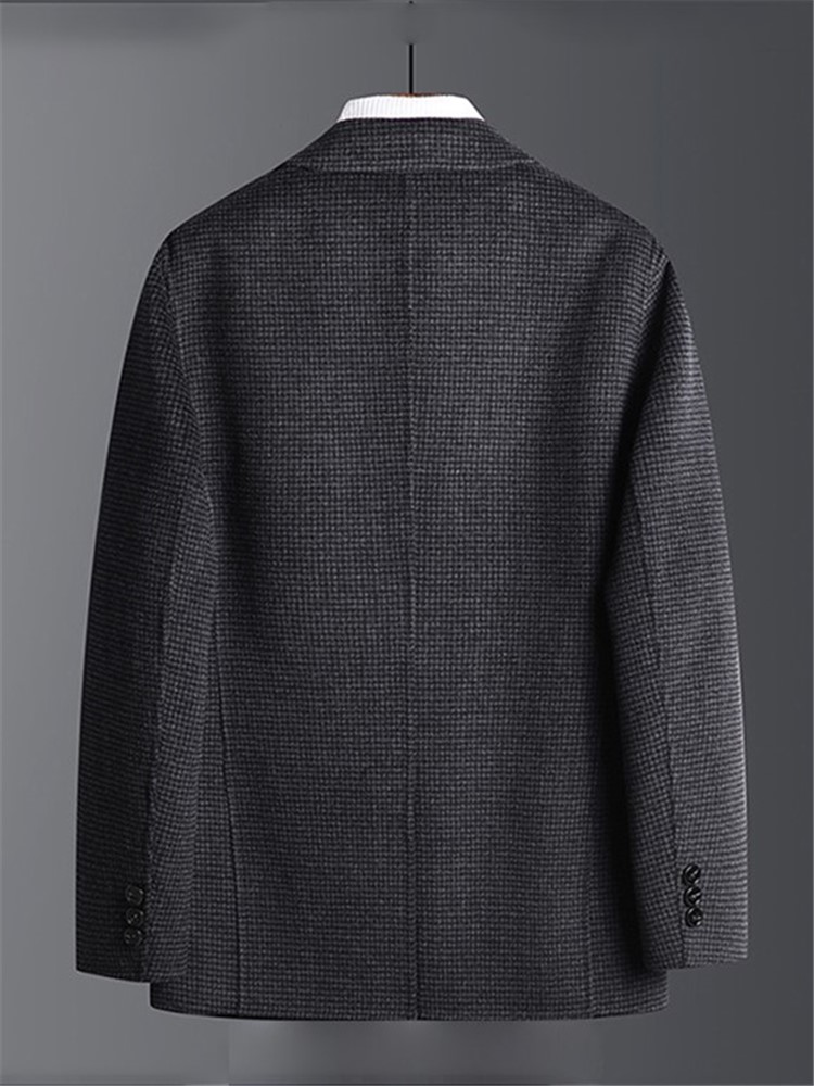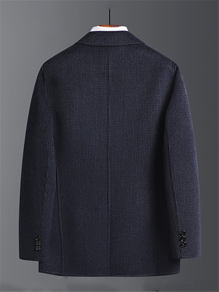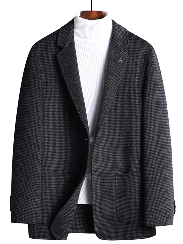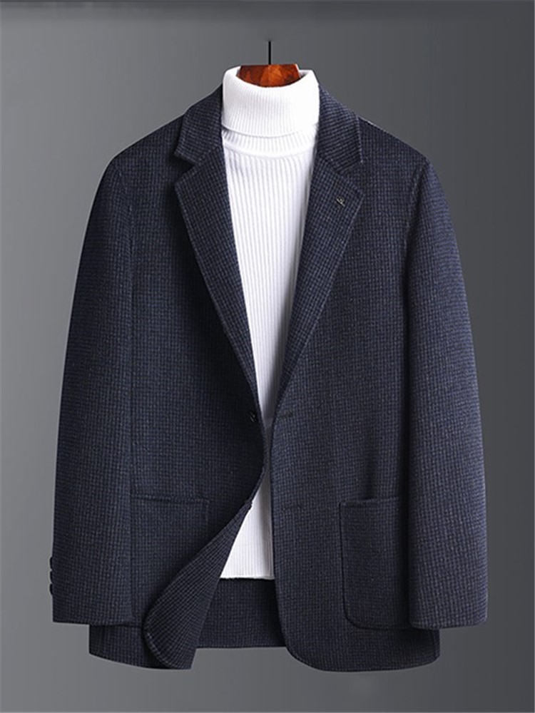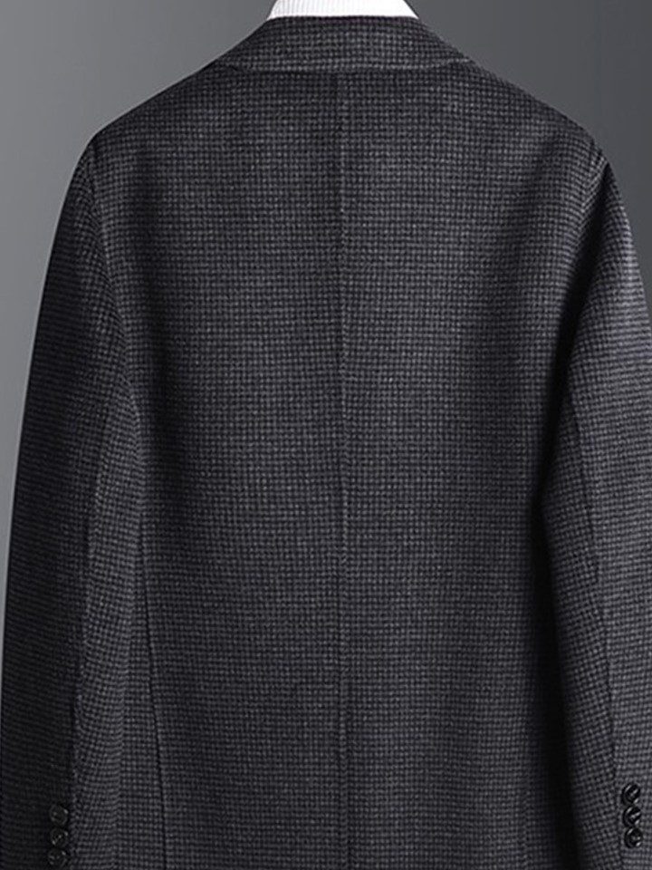 西服采用羊毛呢的面料制成,聚酯纤维、羊毛和棉混纺而成,柔软不失挺括,轻巧而不厚重,保暖性哈不错。因为不是纯羊毛,因此亲肤性好,不扎身,洗涤过后不易缩水变形。