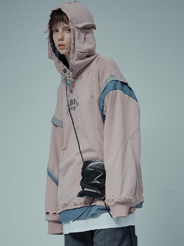 连帽的领子设计,领子可收起帽子变成空间感十足立领,大方实用百变,工装的抽绳以及加大口袋作为点缀,金属拉链装饰搭配,怀旧气息十足的卫衣。