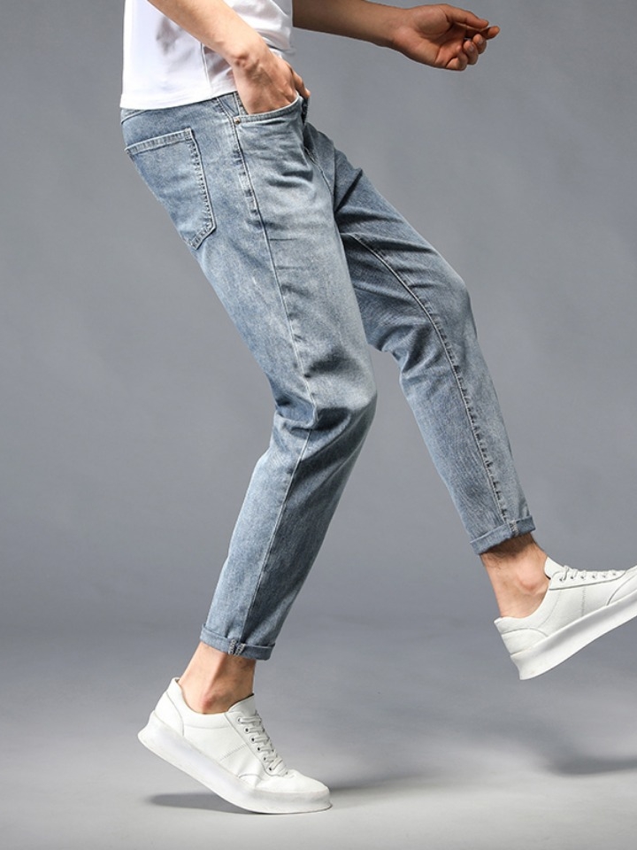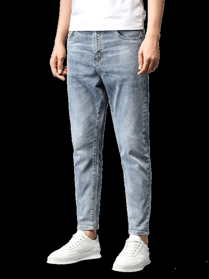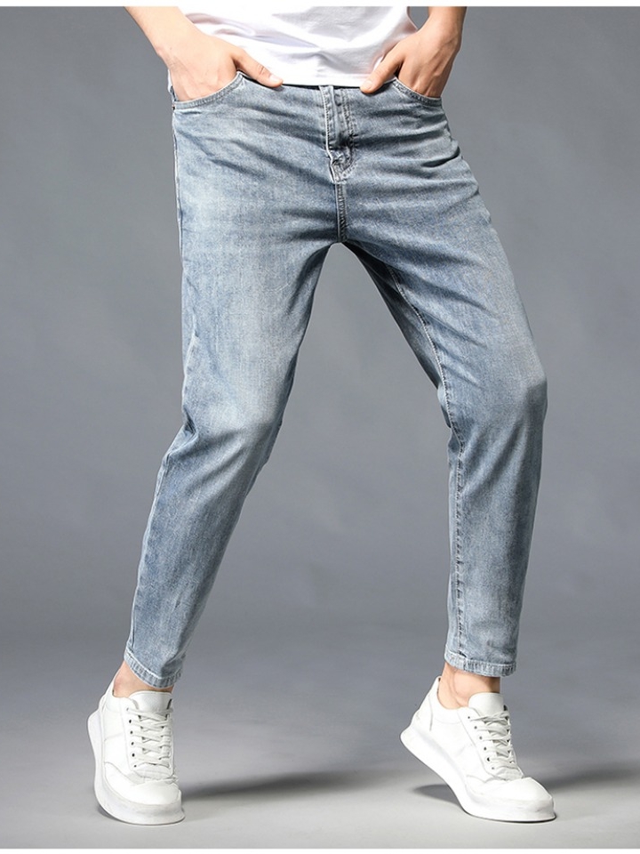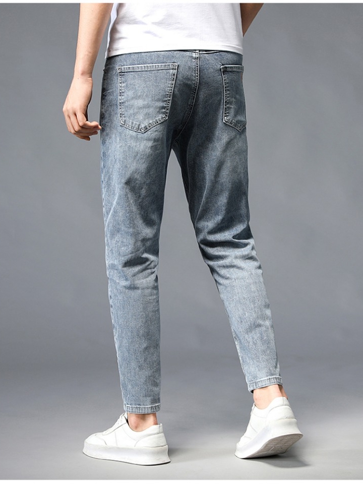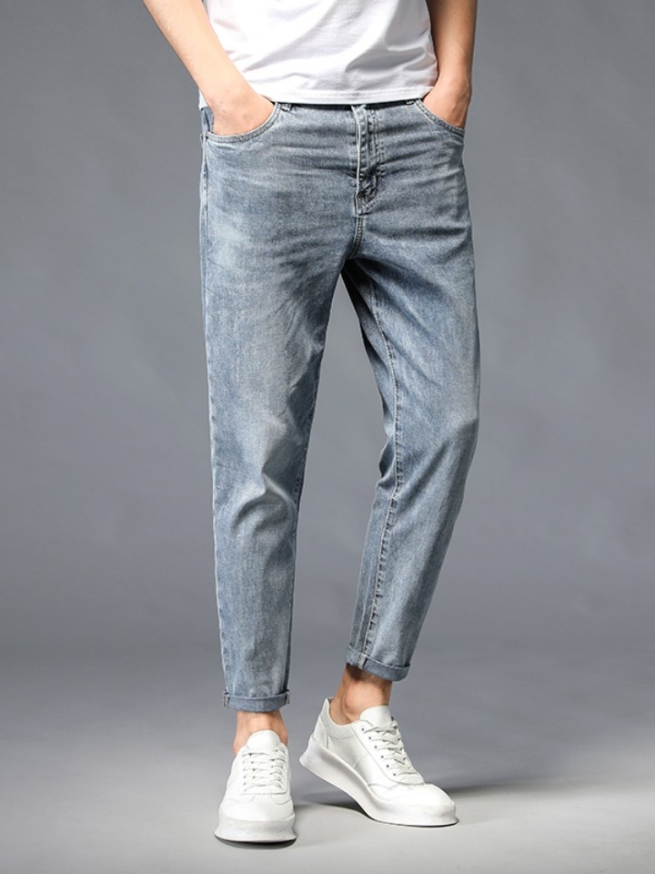 潮流牛仔九分裤采用韩版大牌修身版裁剪,强调凸显男人的修长腿型,线条干净利落,整体效果更韩范,年轻化。臂部设计美观大方,上身挺括有型,无论站立坐着,彰显时尚洒脱气息。