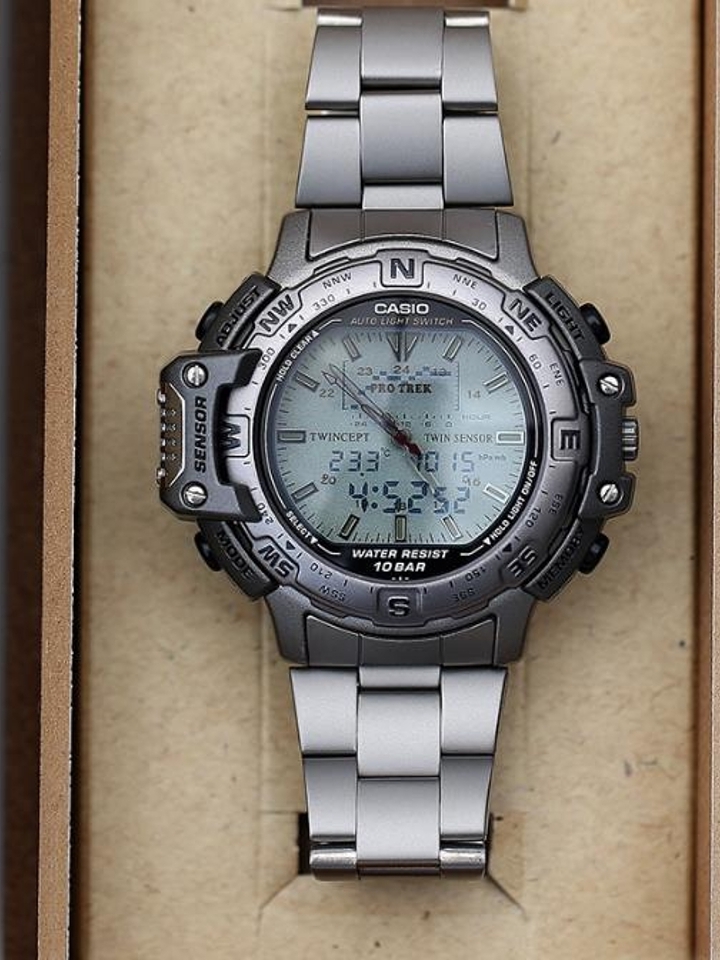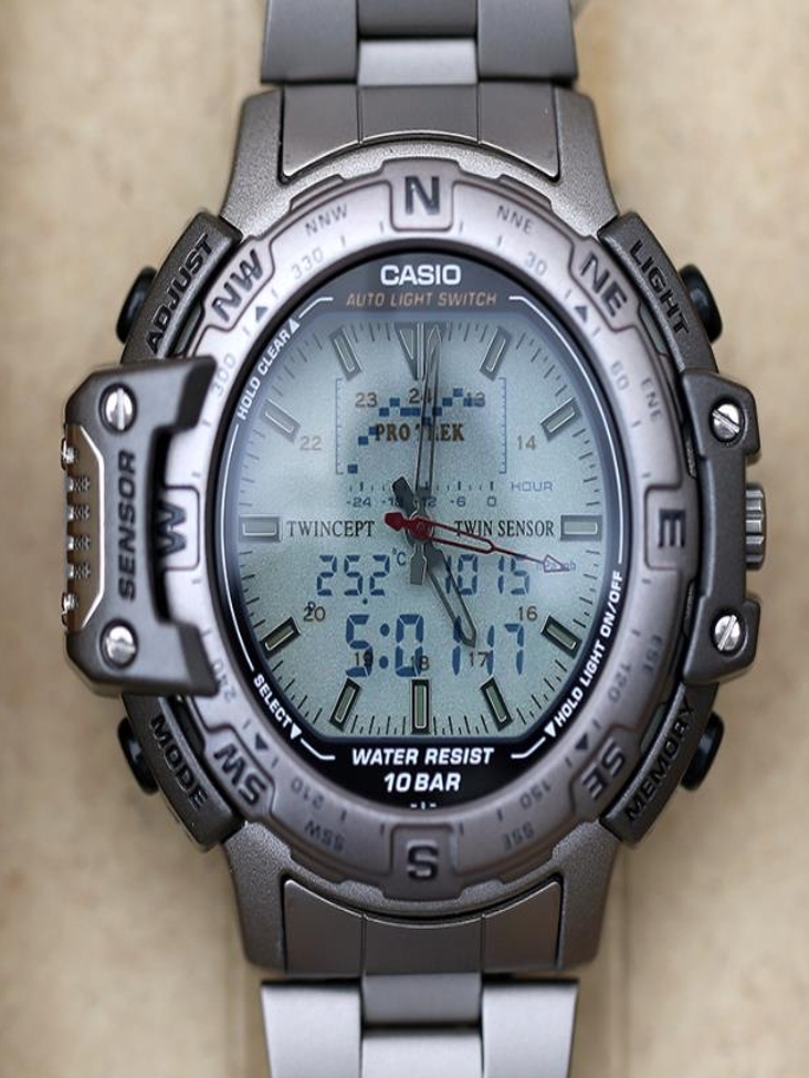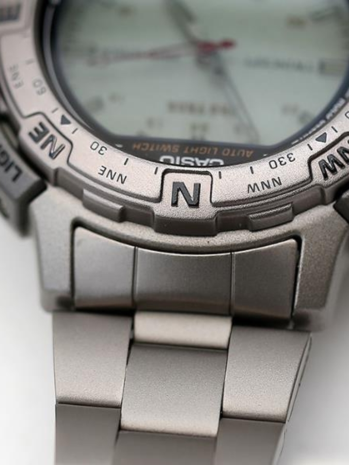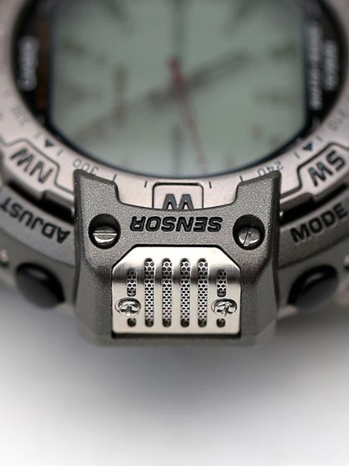 表盘上设有太阳能电板,可将光能转化为电能。同时还具有罗盘功能、抗低温、双LED照明等功能。防滑的按键设于表壳侧边,方便对各种功能进行操作。