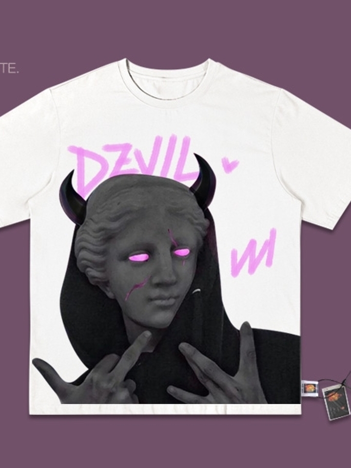 将传统的欧式雕塑融入到这款T恤的印花当中,显得有些经典与复古,同时又在此基础上进行了一系列的改造与加工,显得更加富有创意。