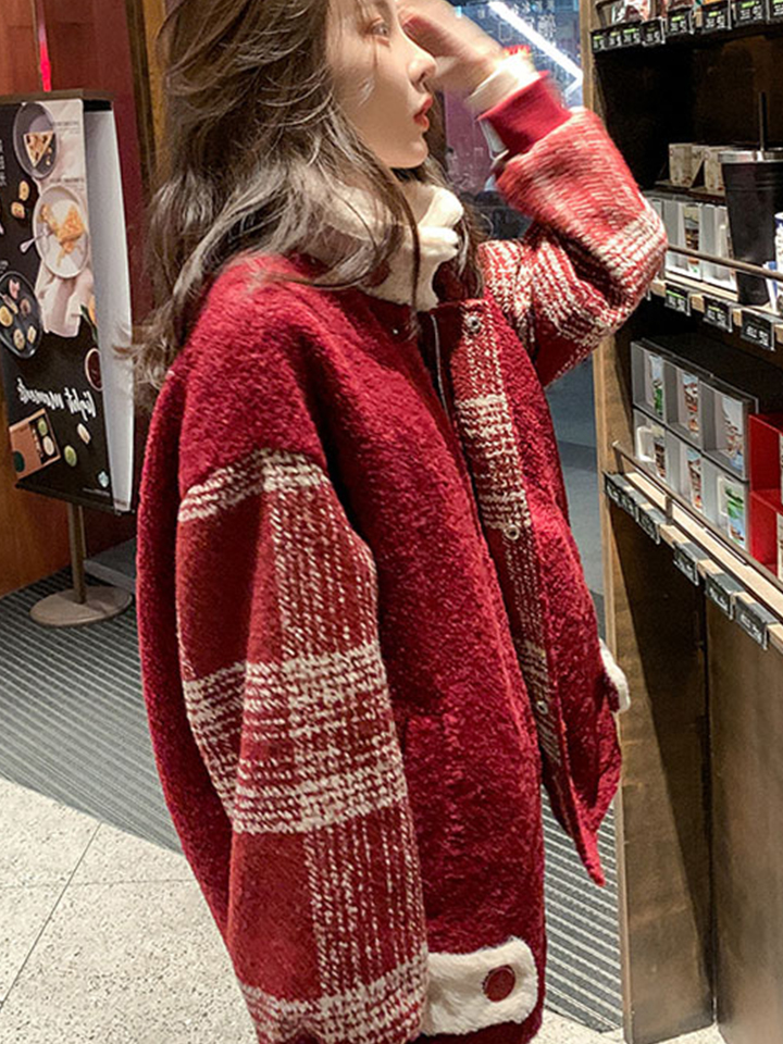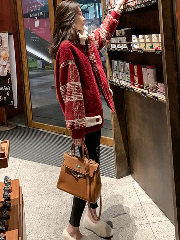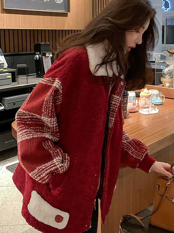 红色的羊毛羔棉服采用撞色立领设计,衣袖融入格纹图案。