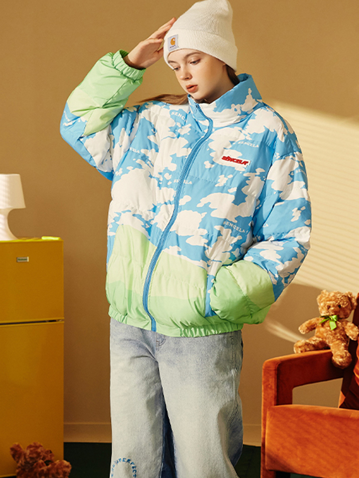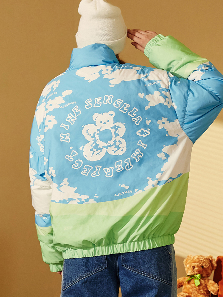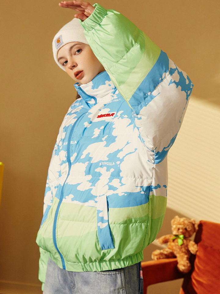 衣身布满蓝白相间的清新印花,衣摆与衣袖融入绿色拼接。