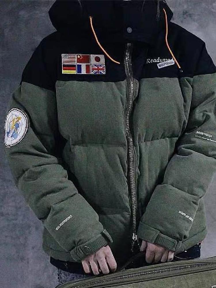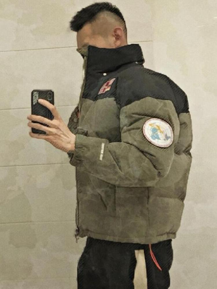 复古街头风格的连帽款羽绒外套,帽子及毛领均采用可拆卸设计,非常实用。两边肩膀及衣服前片呈现出互相呼应的几何拼色效果,门襟两侧则设有对称斜插袋与两用式翻盖口袋,上身更显干练有型。