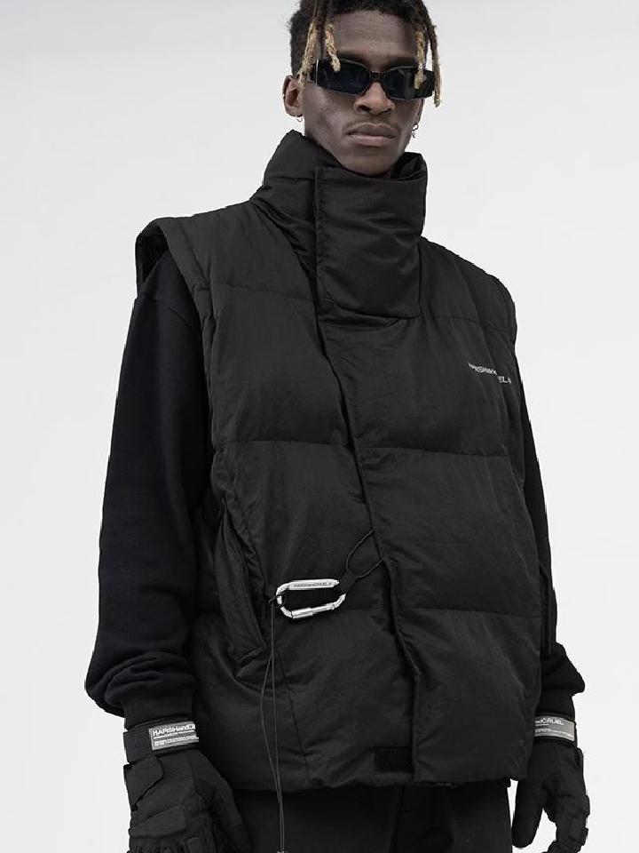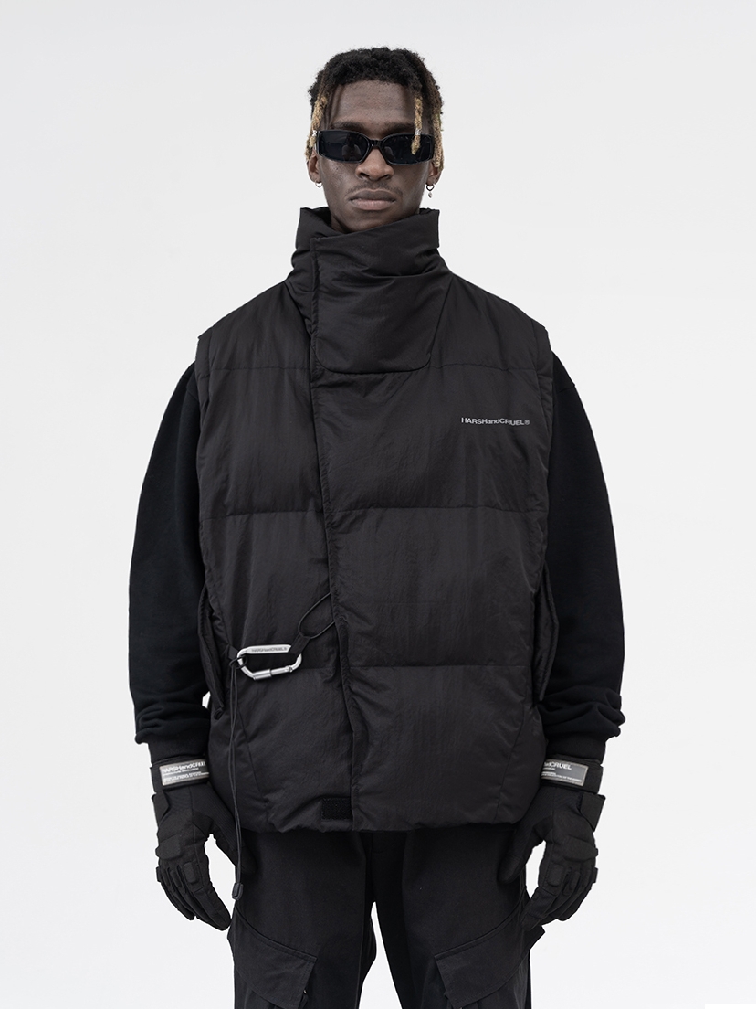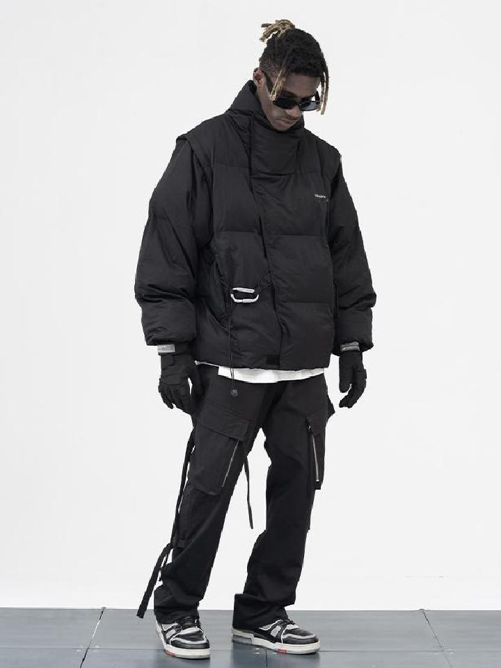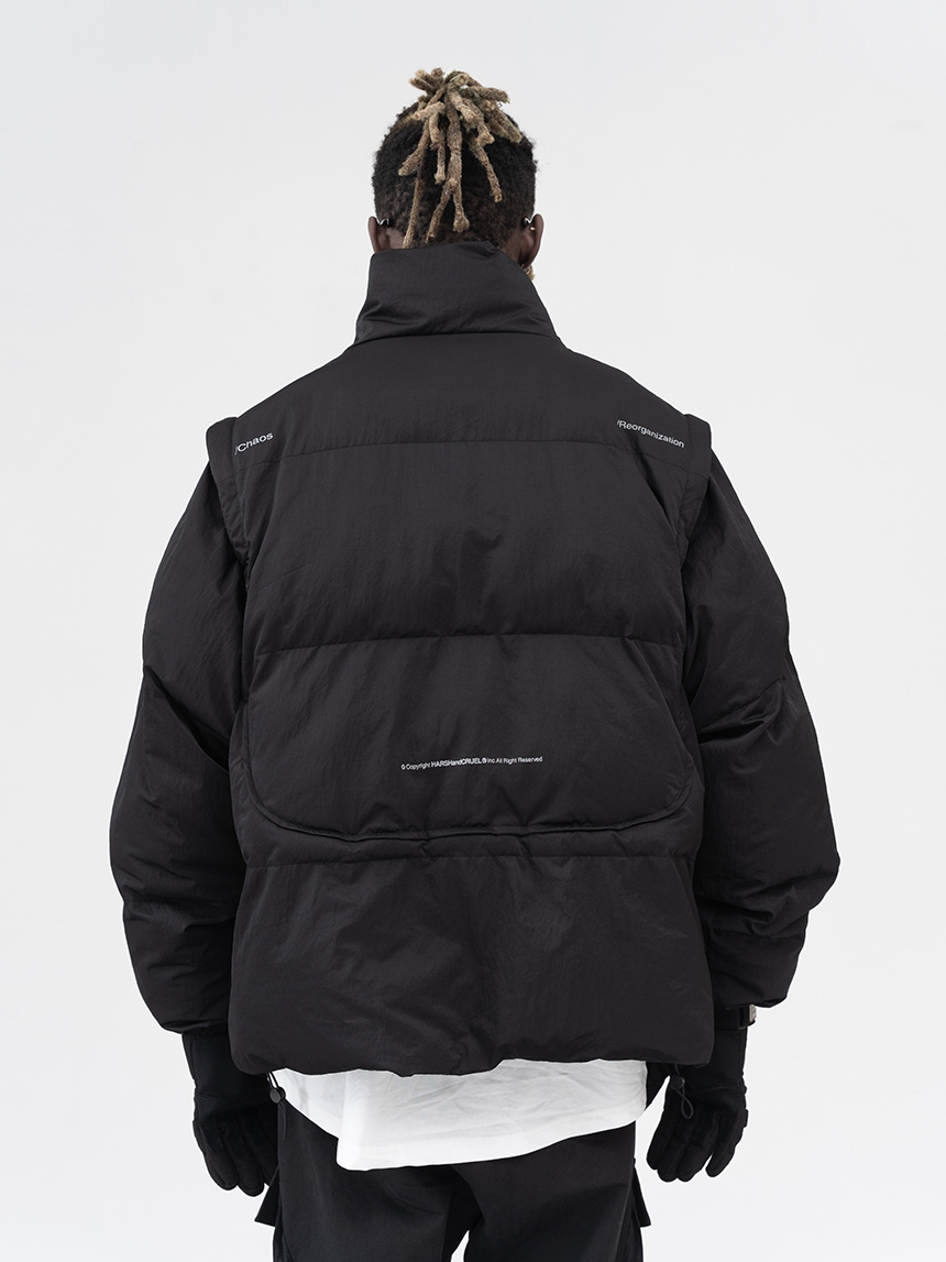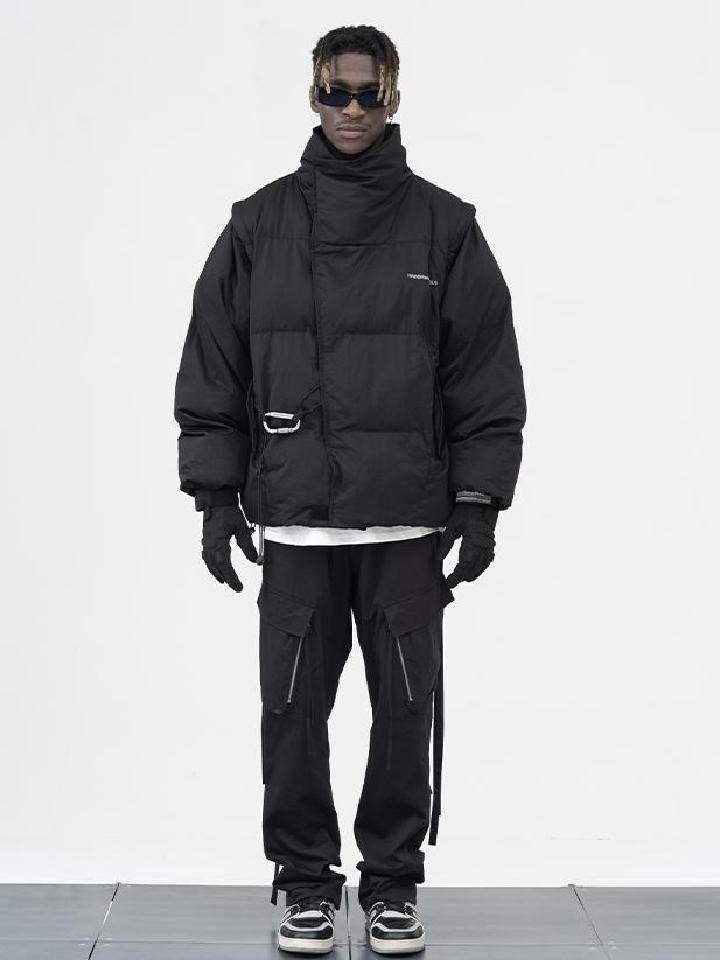 这款不规则裁片可拆卸袖子登山扣羽绒棉服,面料采用经过后期加工处理,轻薄挺阔防静电材质,背后不规则裁片使其产品上身效果廓形更佳。