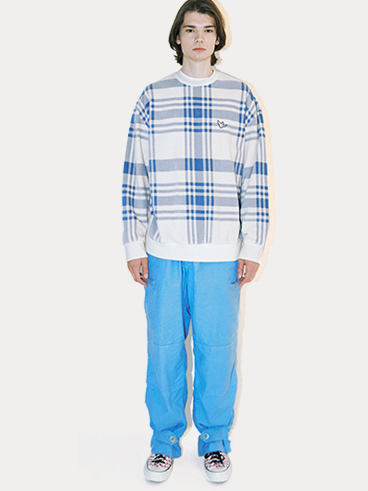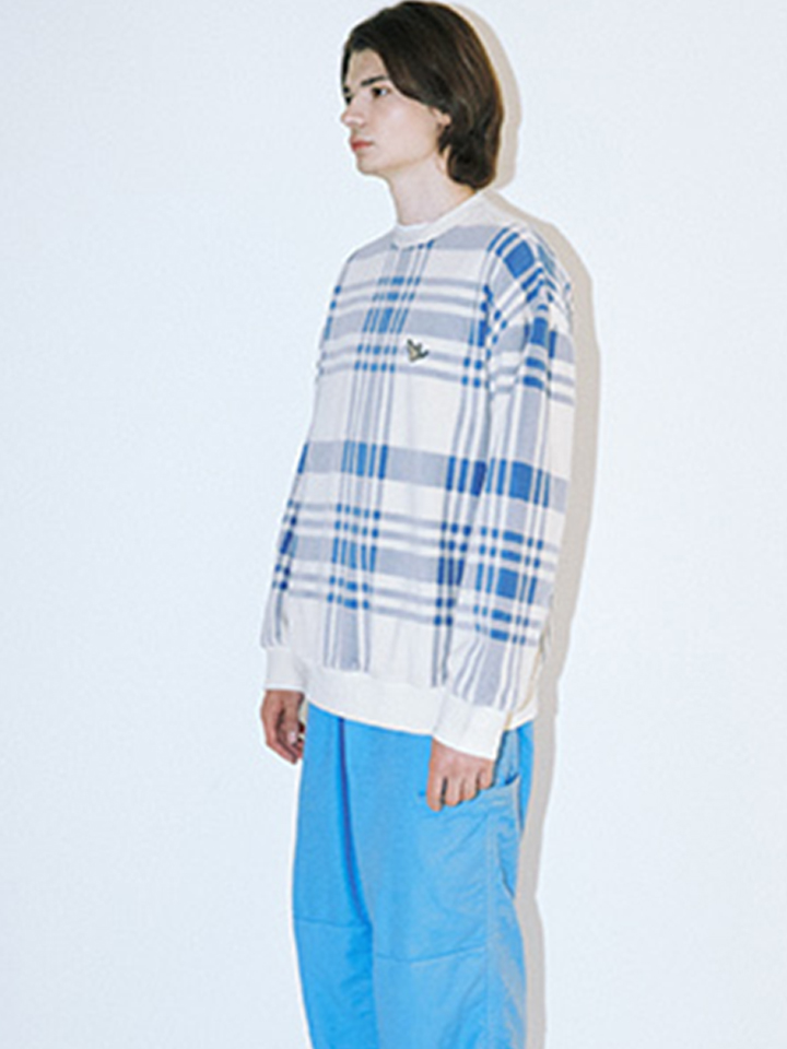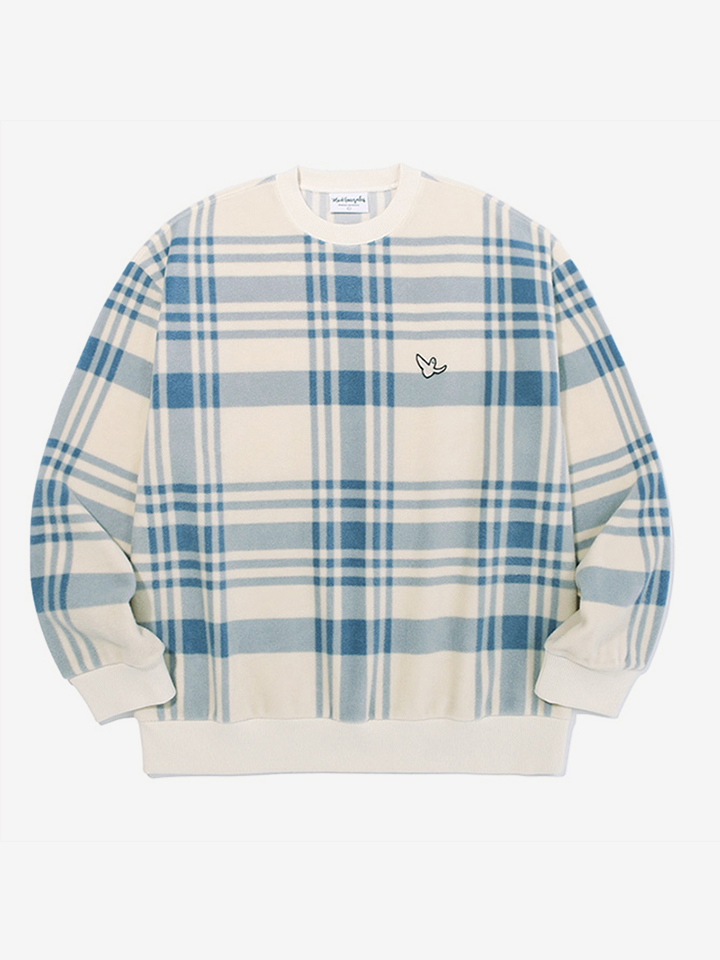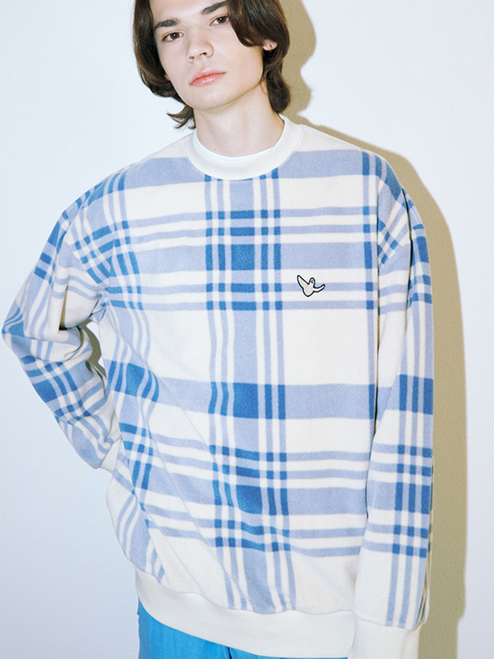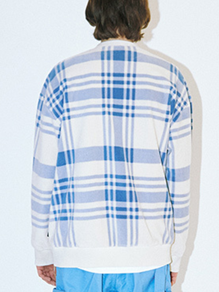 柔软的毛绒套头衫布满复古的格纹图案,增添白色罗纹包边。