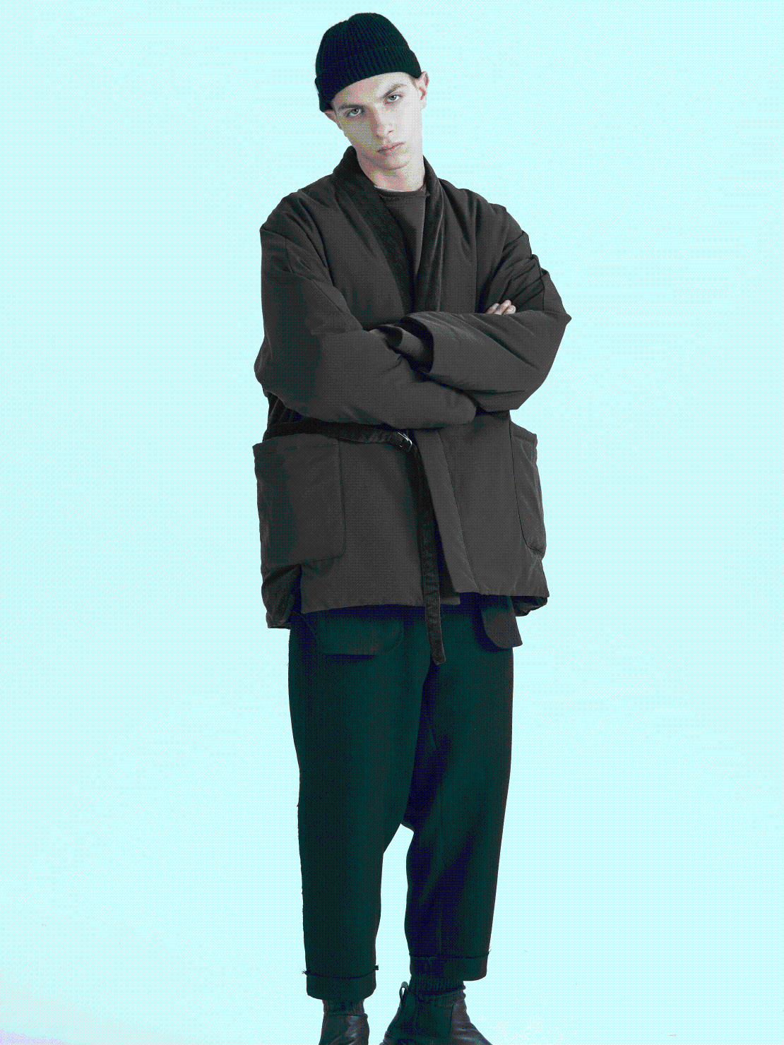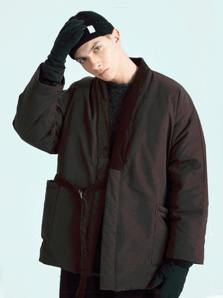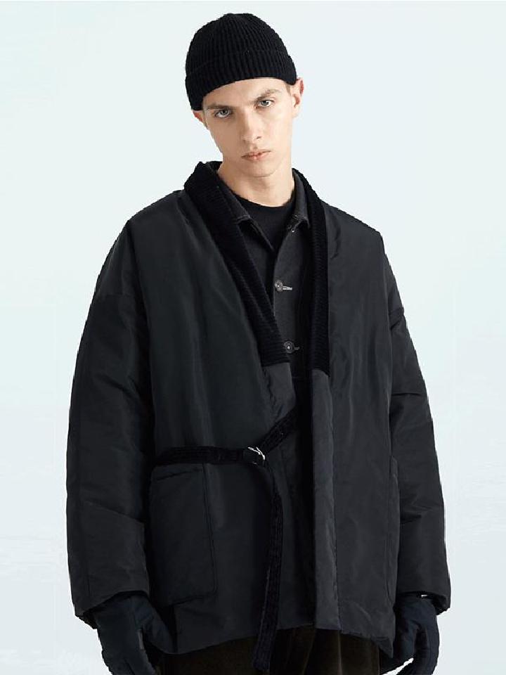 汲取了日本道袍灵感而设计的改良式羽绒服,领口、下摆及后背处独到地选用了厚实的灯芯绒面料,异材质同色系拼接剪裁让整件单品的廓形更加明晰硬朗。