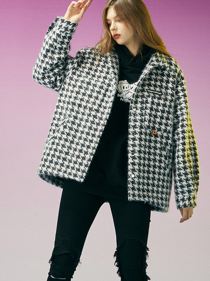 气质的小翻领设计,修饰脸型更温暖。黑白千鸟格的衣身,更具青春气息。