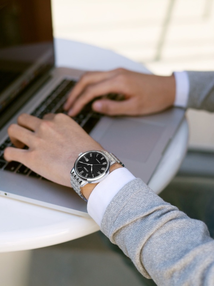 通常不锈钢表的外观设计多为单一的纯色调,而这一款手表选用了不锈钢间金色表带和表壳设计,细腻精致的玫瑰金色,带有浓郁的复古气息,尽显雍容华贵,让人眼前一亮。通过表盘我们可以进行常规读时之外还能够了解到日期,星期,使这款表的实用性更强。