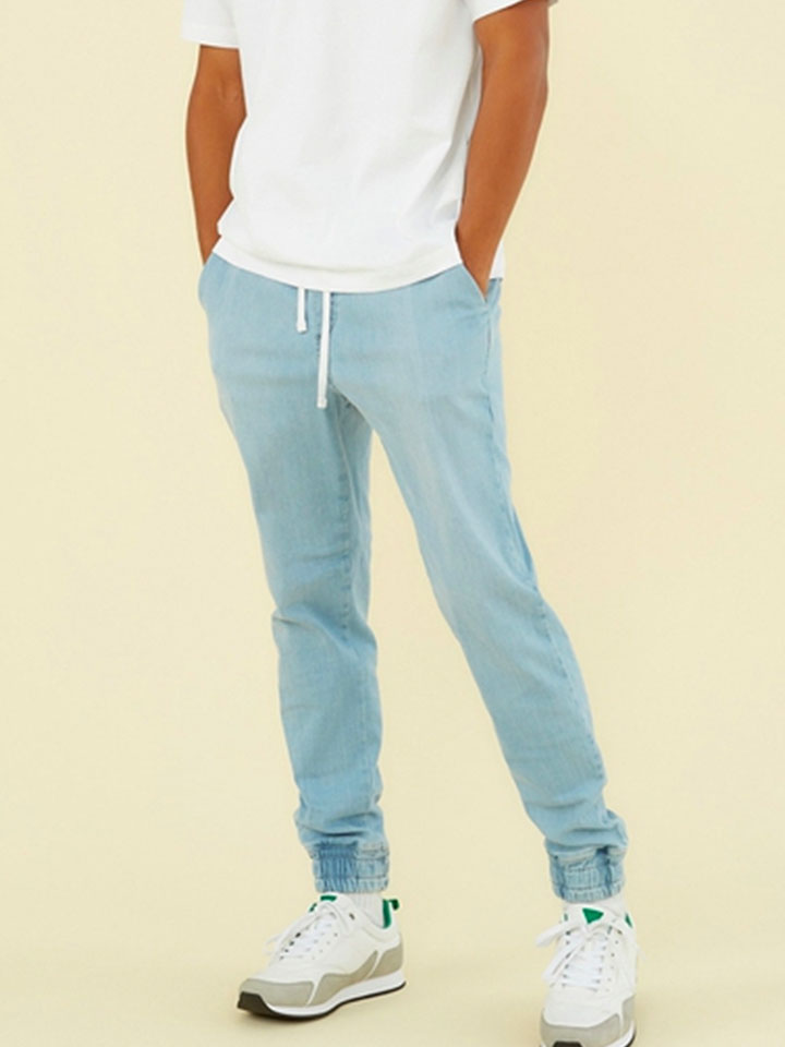 GUESS这件男士简约款式的短袖上衣,下半身可以搭配一款浅蓝色的休闲牛仔长裤,再搭配一双白色的系带款式的厚底休闲运动鞋。