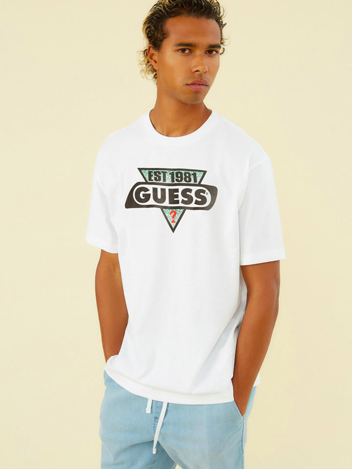 GUESS的这款Originals2021新春男复古字母LOGO圆领短袖T恤,衣身有两种颜色可以选择,白色和蓝色,纯棉材质舒适自在。