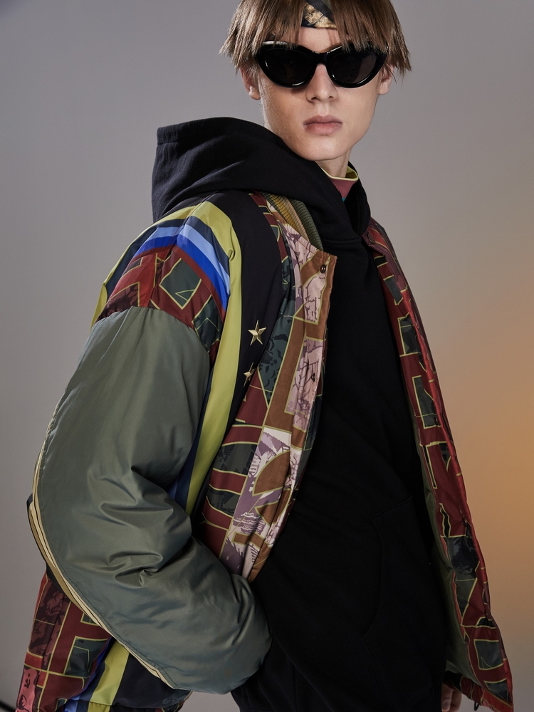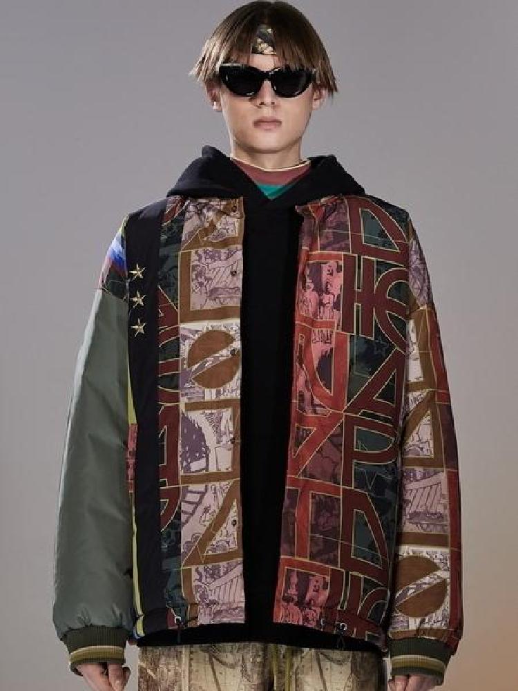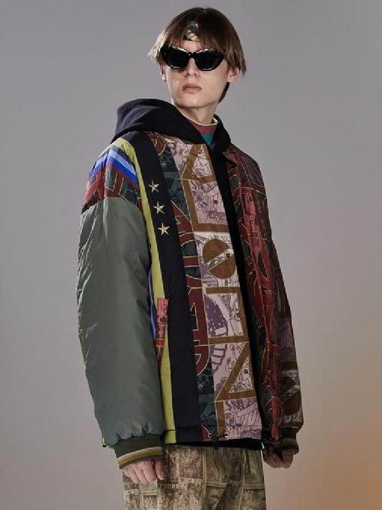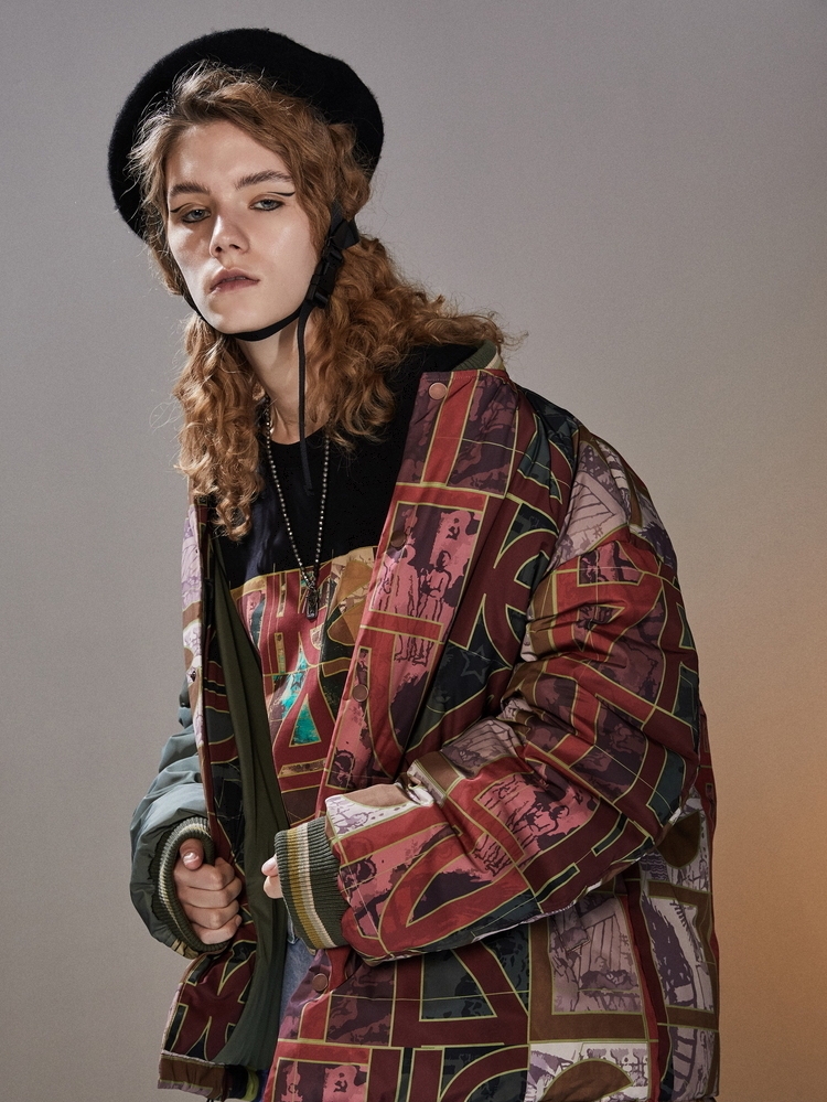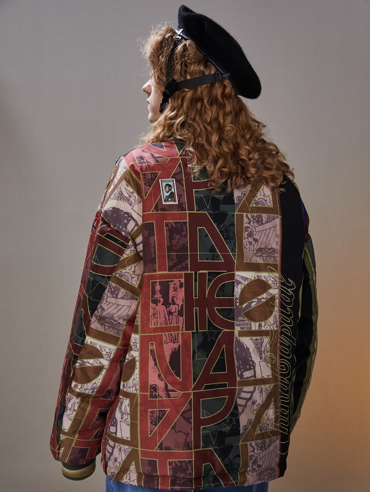 香港GENANX原创设计师潮牌独家出品的这款羽绒服,前胸的几何框架字母印花与后背的抽象图案条纹印花相互呼应,加上袖子的撞色字母印花,酷潮个性,街头感十足。