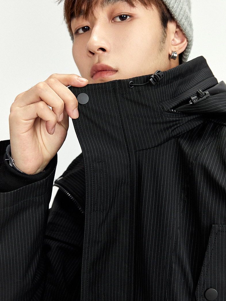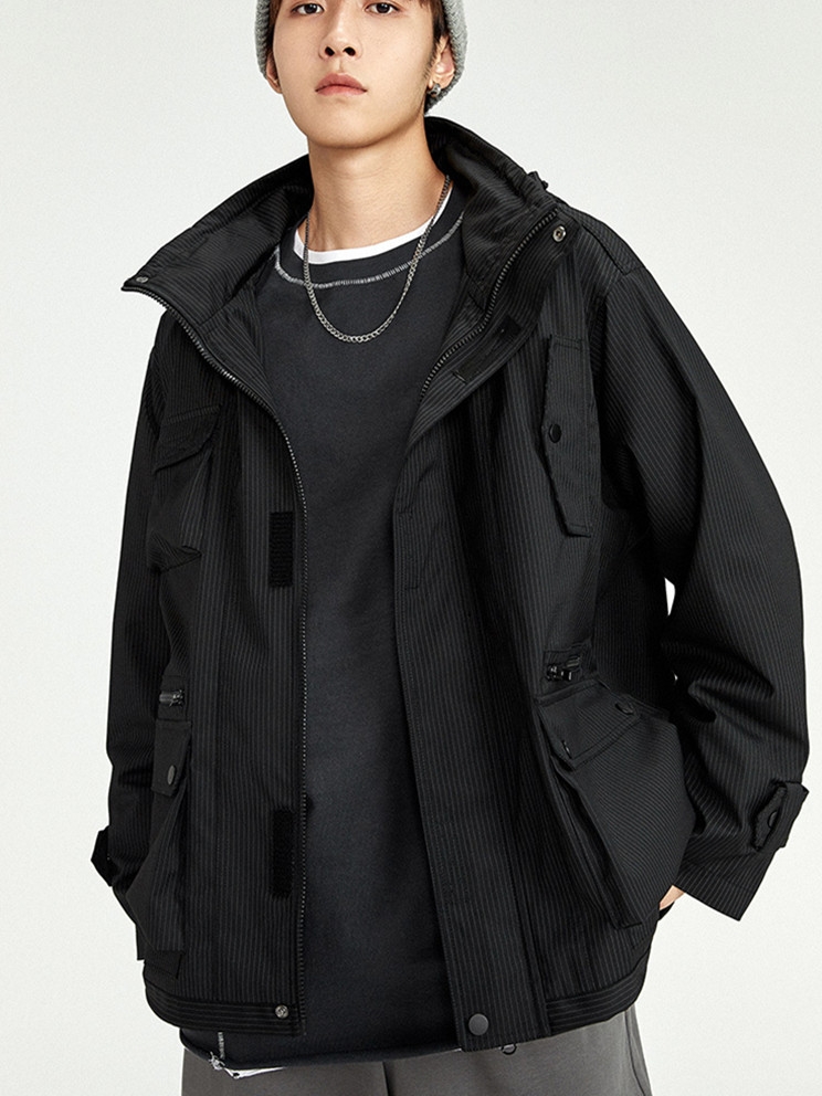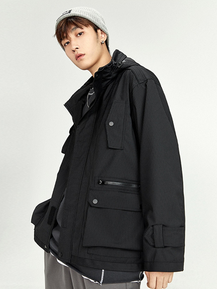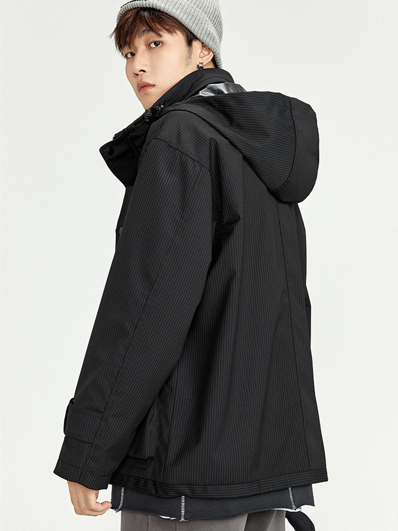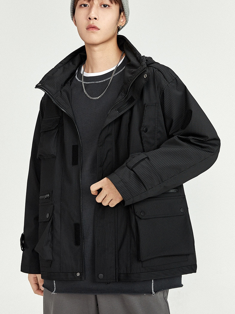 来自太平鸟带来的这款宽松连帽工装外套,连帽设计,实用性强,黑色搭配工装版型可谓是展现出一种干练又大气的风格。