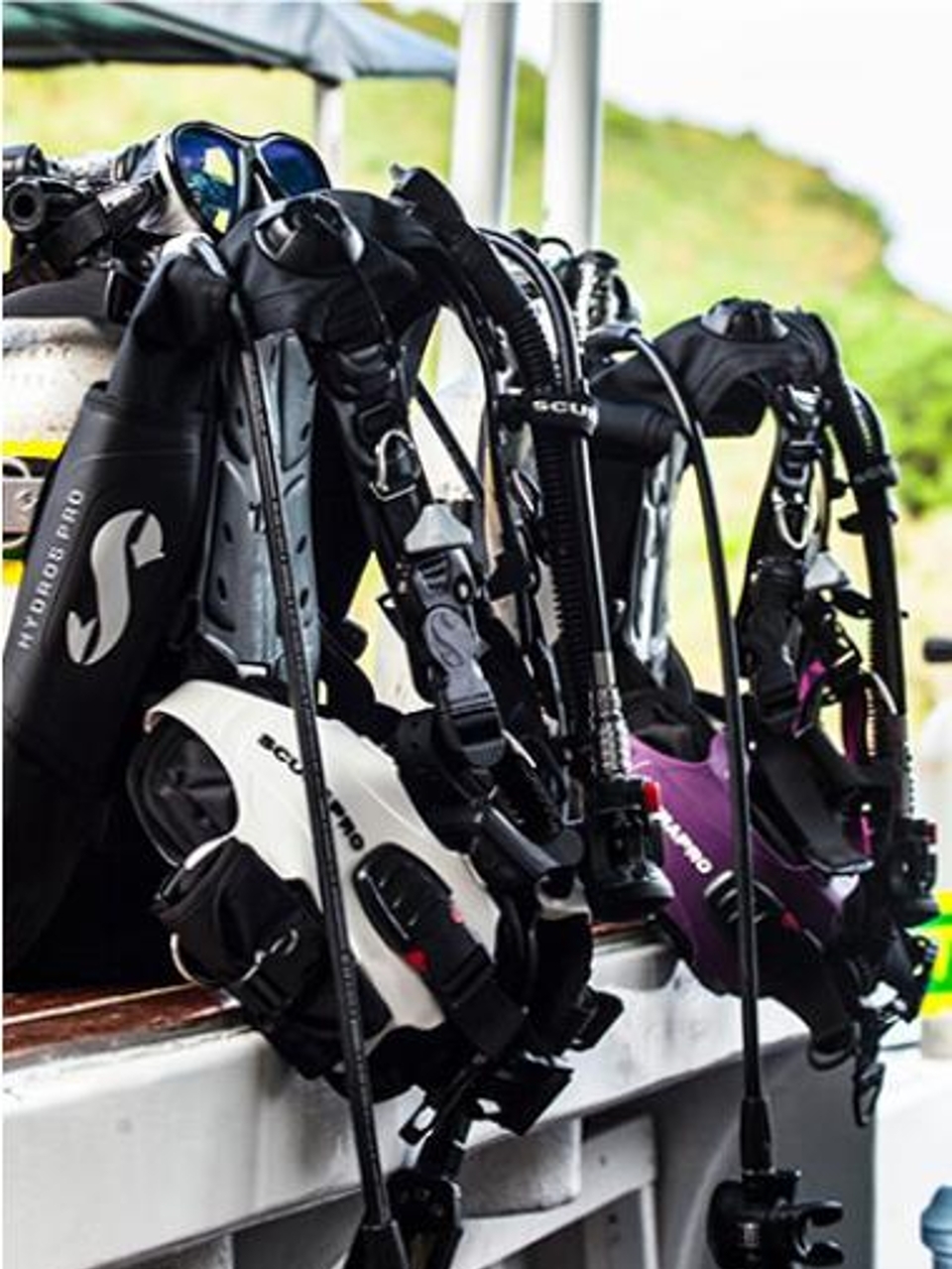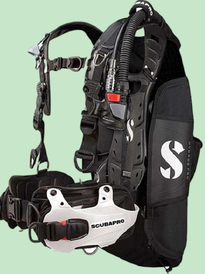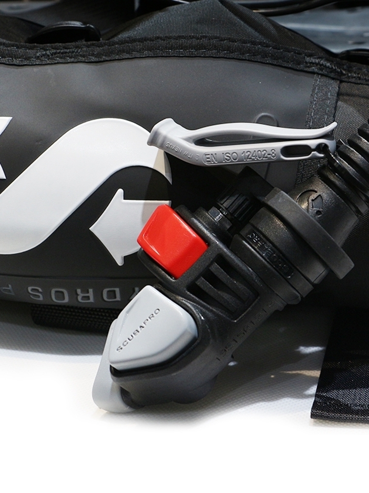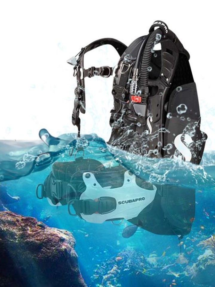 浮力调节背心,顾名思义就是一件无袖的背心,可以通过充气、放气来调整水下的浮力,结构有点像救生衣。压缩气瓶是安装在BCD上的,和呼吸调节器连在一起。由于气瓶较重,整套装备穿起来并不容易,往往需要潜伴的帮助。