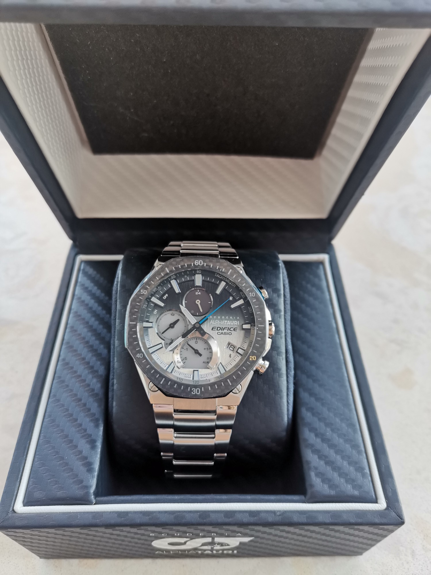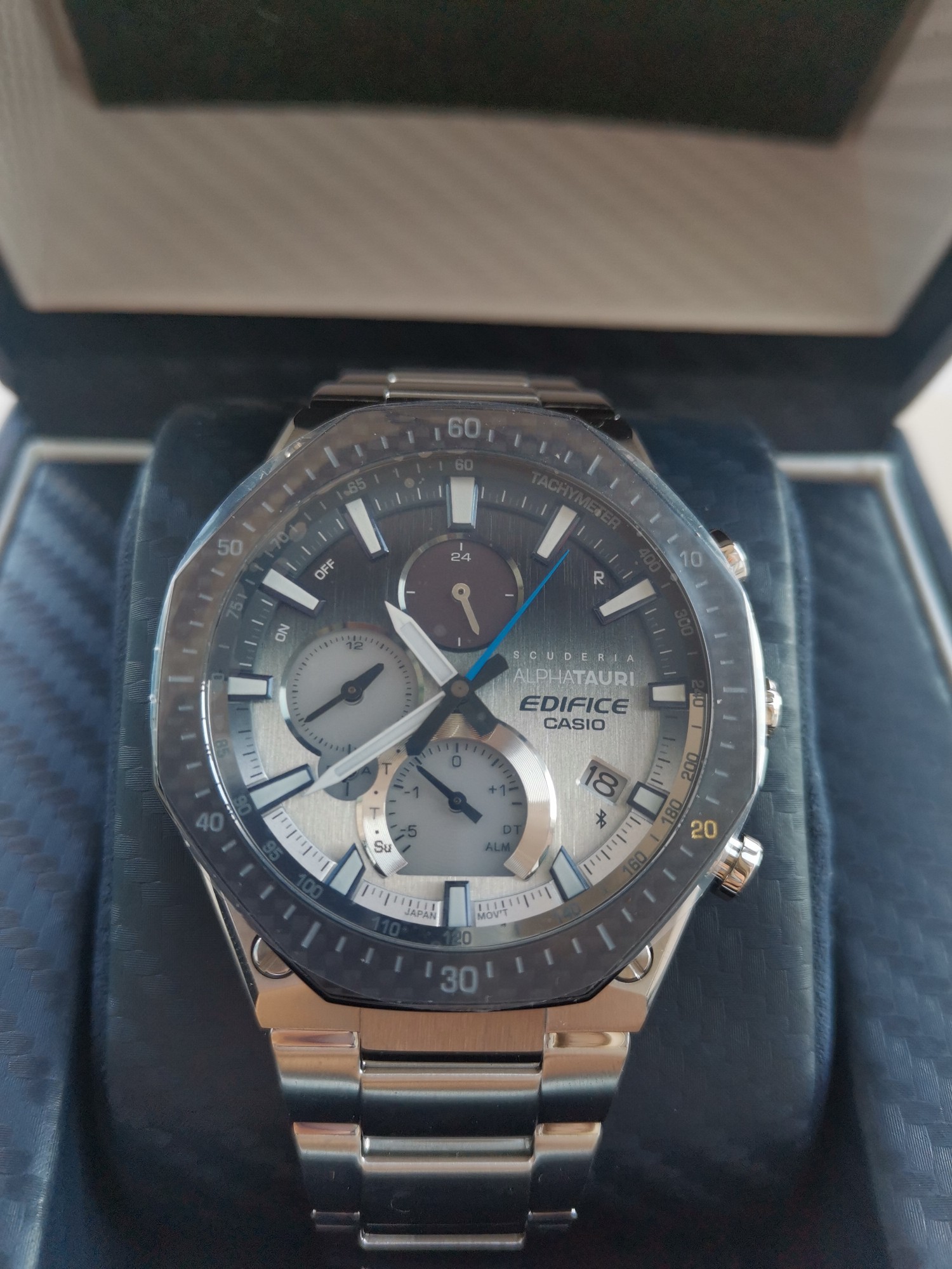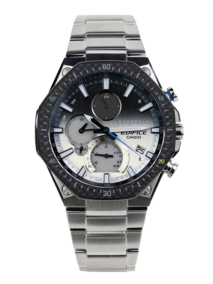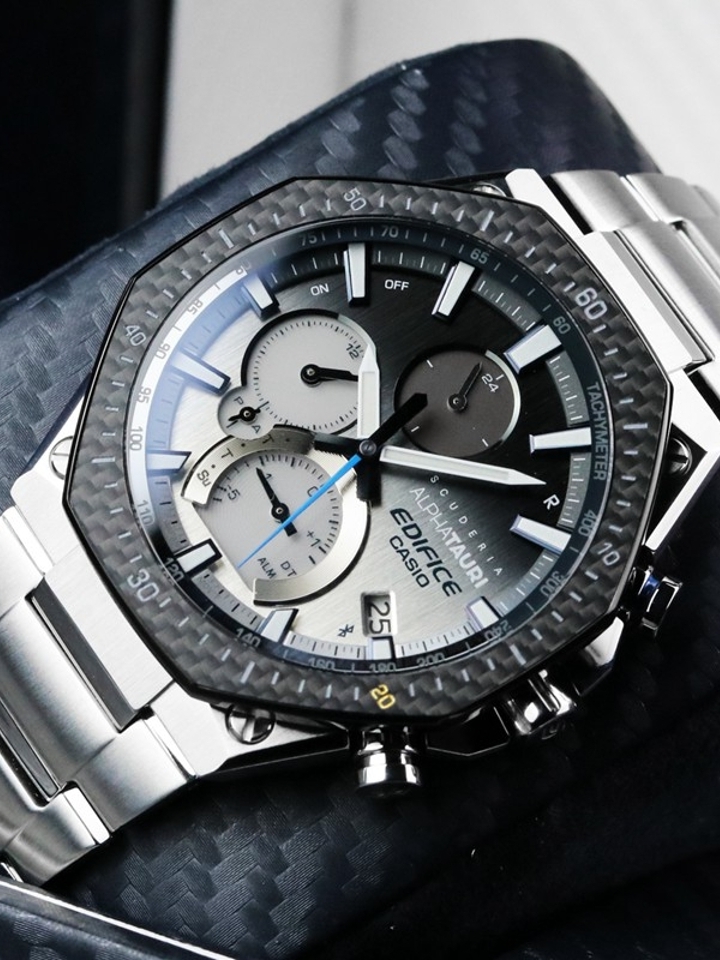 黑金风格作为灵魂,搭载太阳能,并且加入高科技蓝牙,实现手表与手机实时互动操作,连赛车用的测速计功能也融入手表中,并具备防水100米,外型利落帅气。