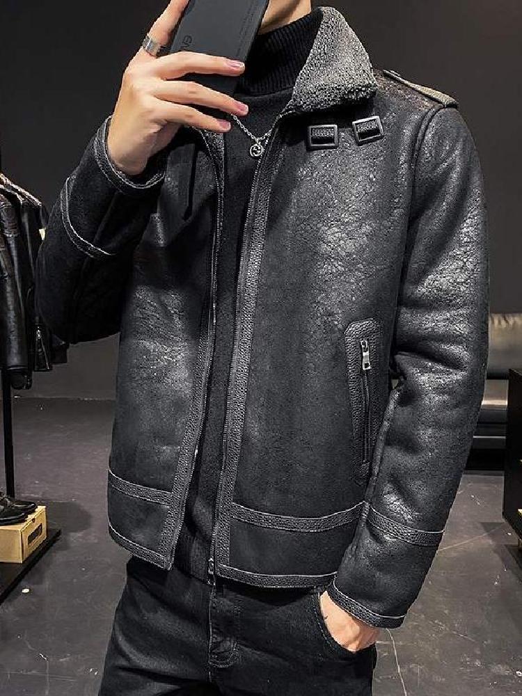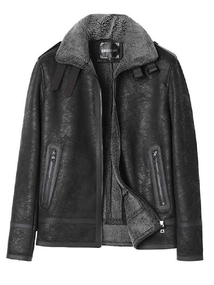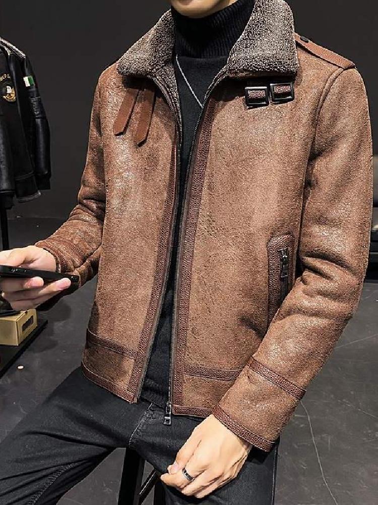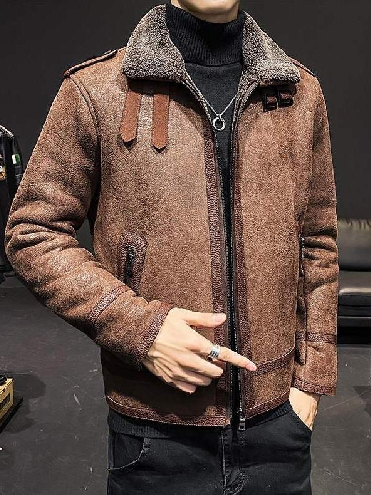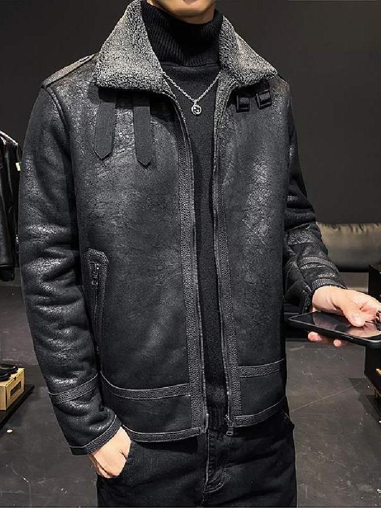 带点机车风格和西部风格的夹克外套。仿麂皮外层,仿羊羔绒内层,斜拉链门襟,前有两个假贴袋,拥有这款夹克你就是冬天的赢家。