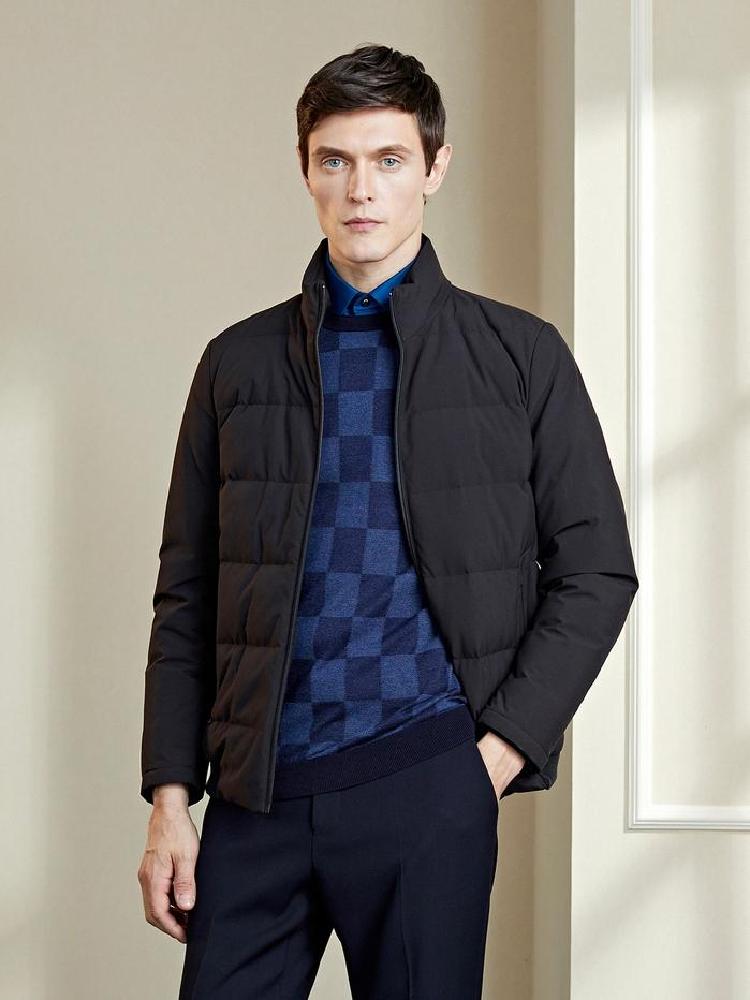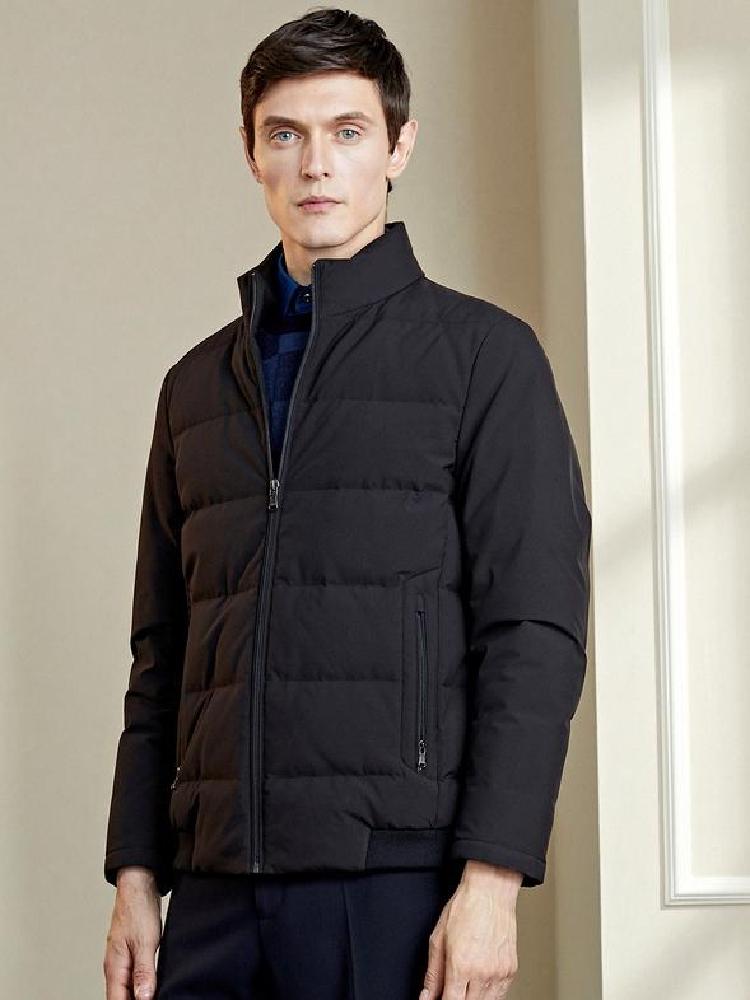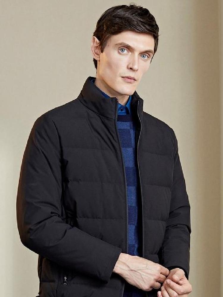 商务立领搭配单排扣拉链,商务中透出一丝休闲,配合90白鸭绒,花纹内里,辑行裁剪,配合防风面料,冷冬力荐