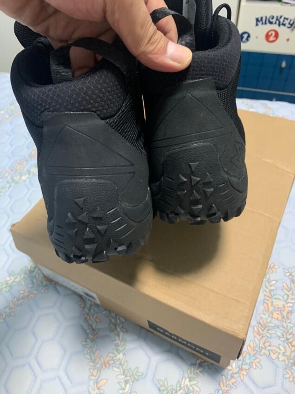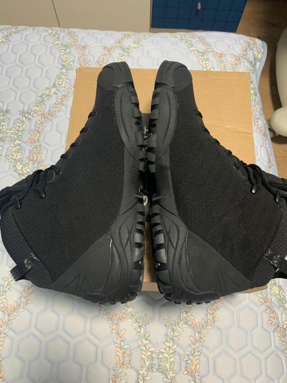 已上脚,已下水。 鞋面不用说,鞋舌防水,鞋带一般。 穿着舒适,前脚掌着力略薄于后脚掌,有利于长时间徒步。 内衬为了透气散热比较薄,不适合特别寒冷的地区。不过作为普通户外爱好者,绰绰有余。 不对称设计穿着很好看。