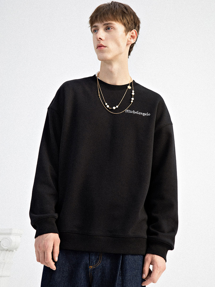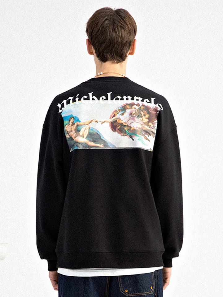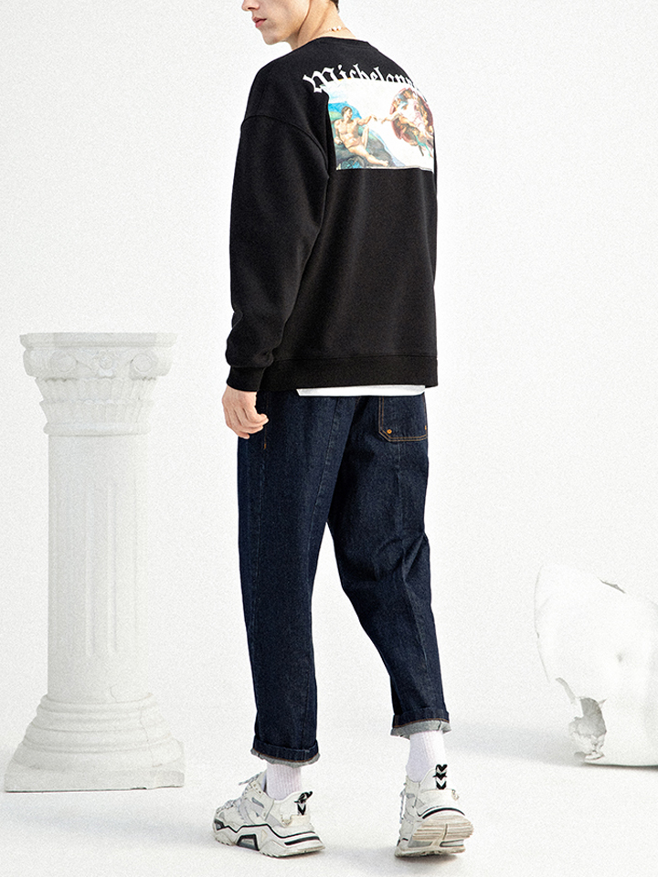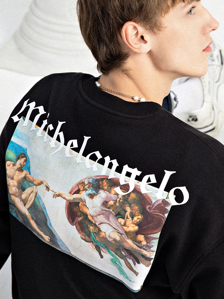 此款卫衣在简洁后背处,加入了复古油画风情与英文艺术字体相结合的创意印花作为亮点装饰,展现别具一格的街头腔调,更具潮流看点。