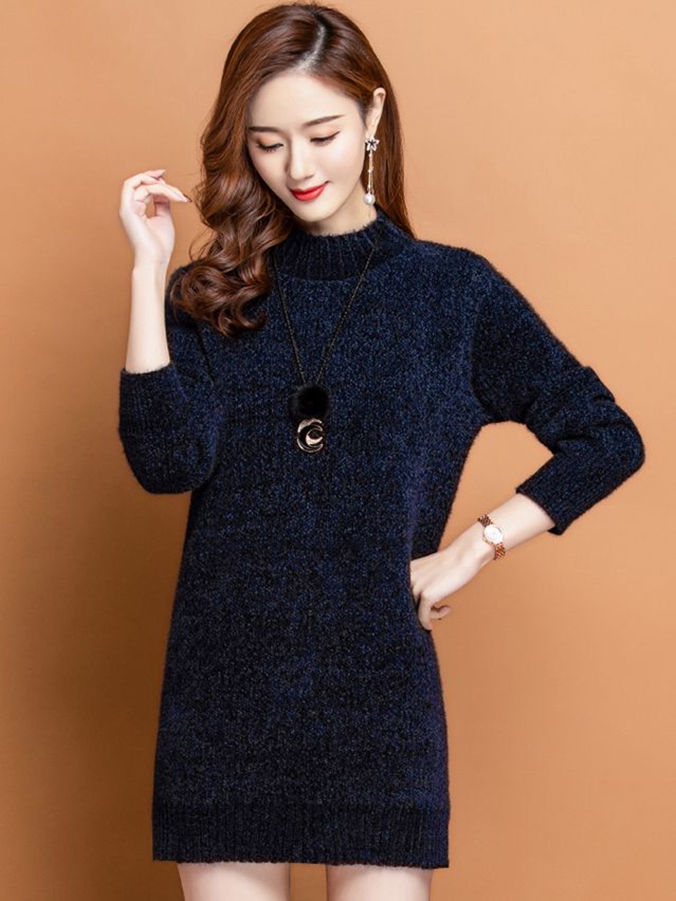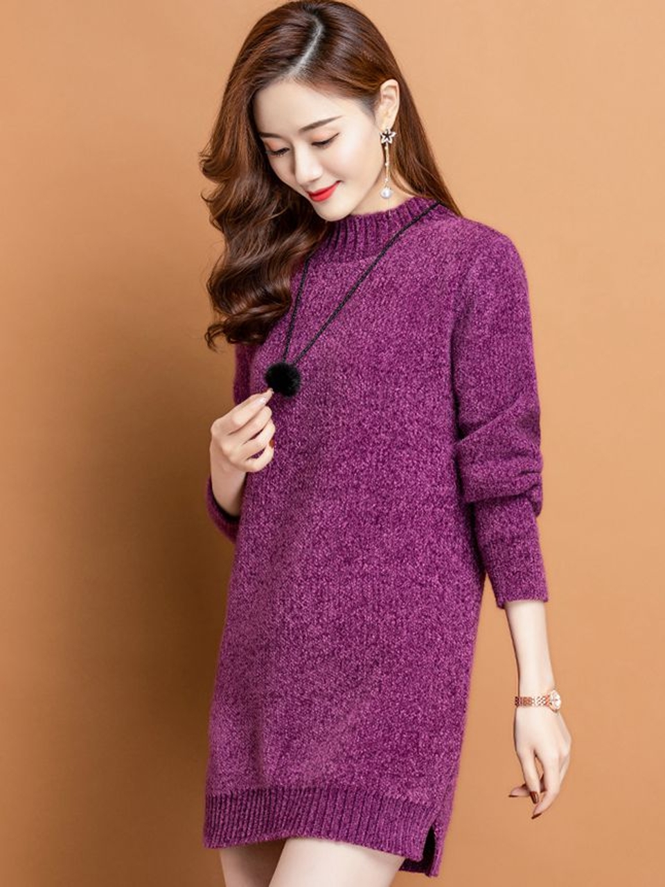 这款中长款的羊毛衫长度是及臀的,触感柔软,保暖性好,让你知性中不失小女人情怀,美丽动人。