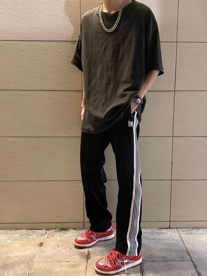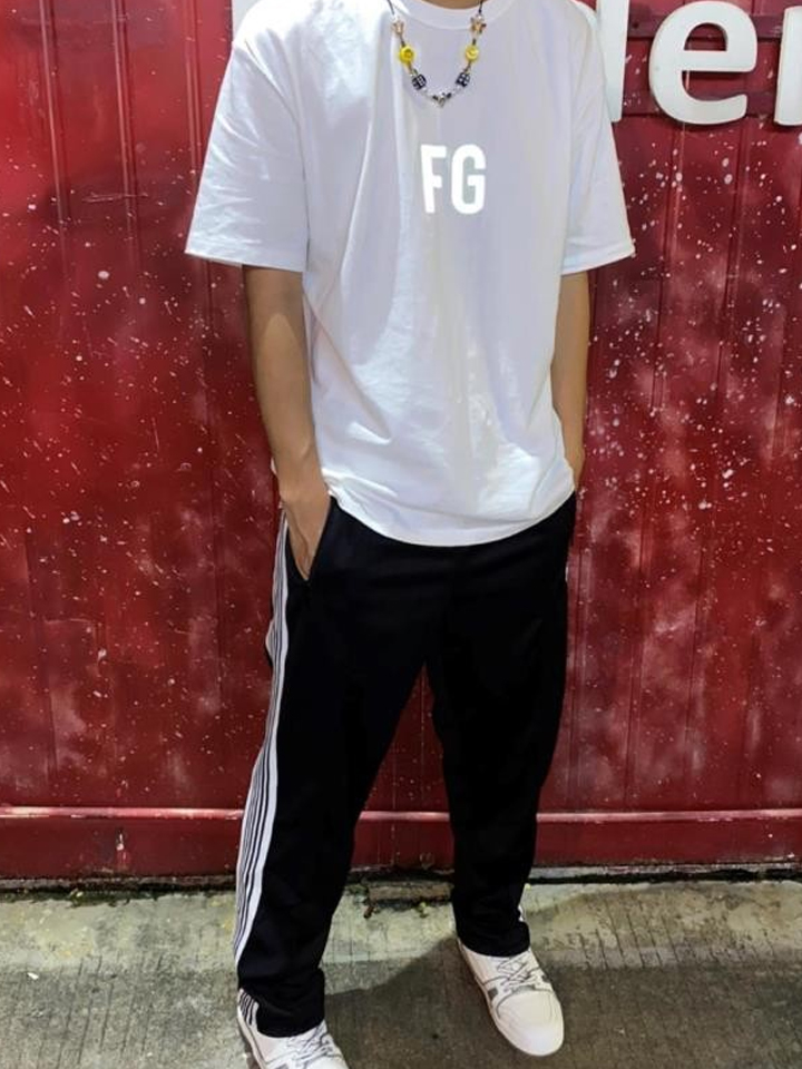 简约T恤搭配宽松长裤和运动鞋,青春十足。