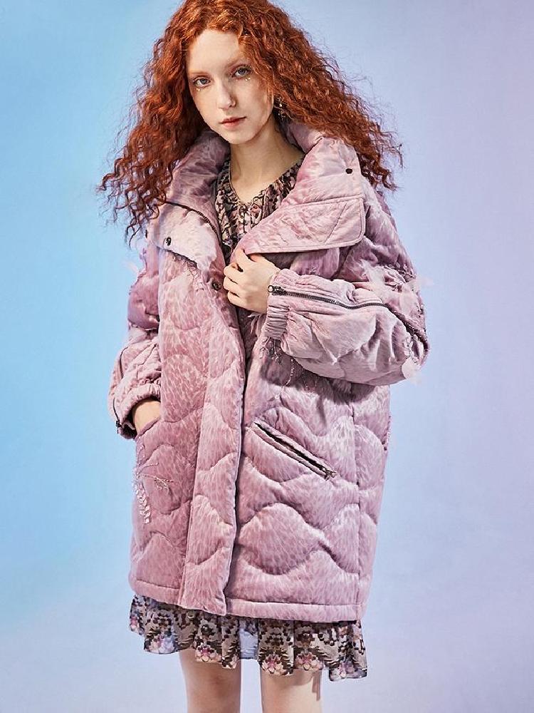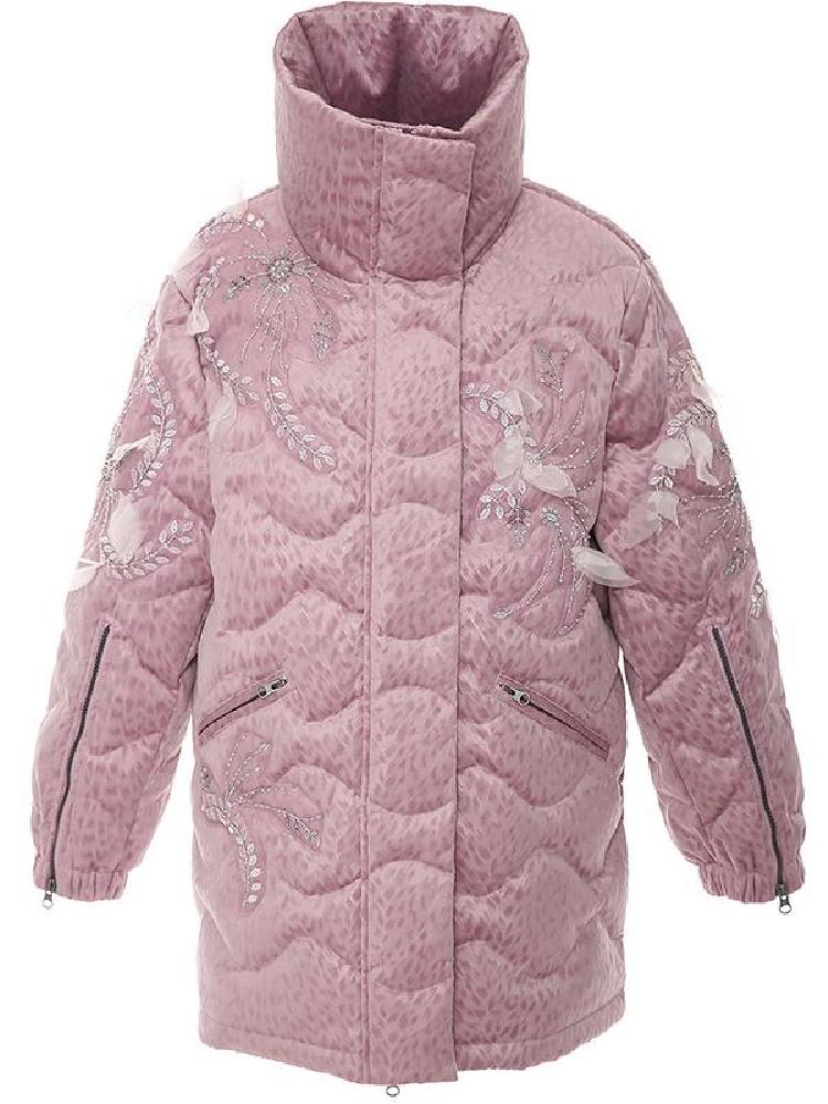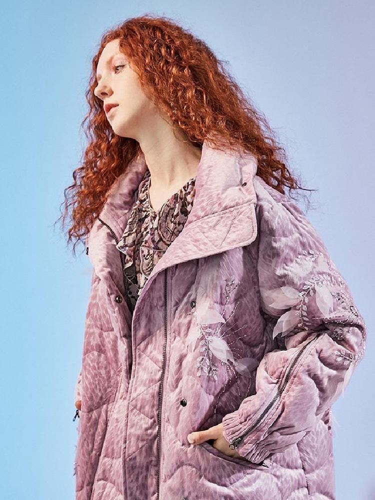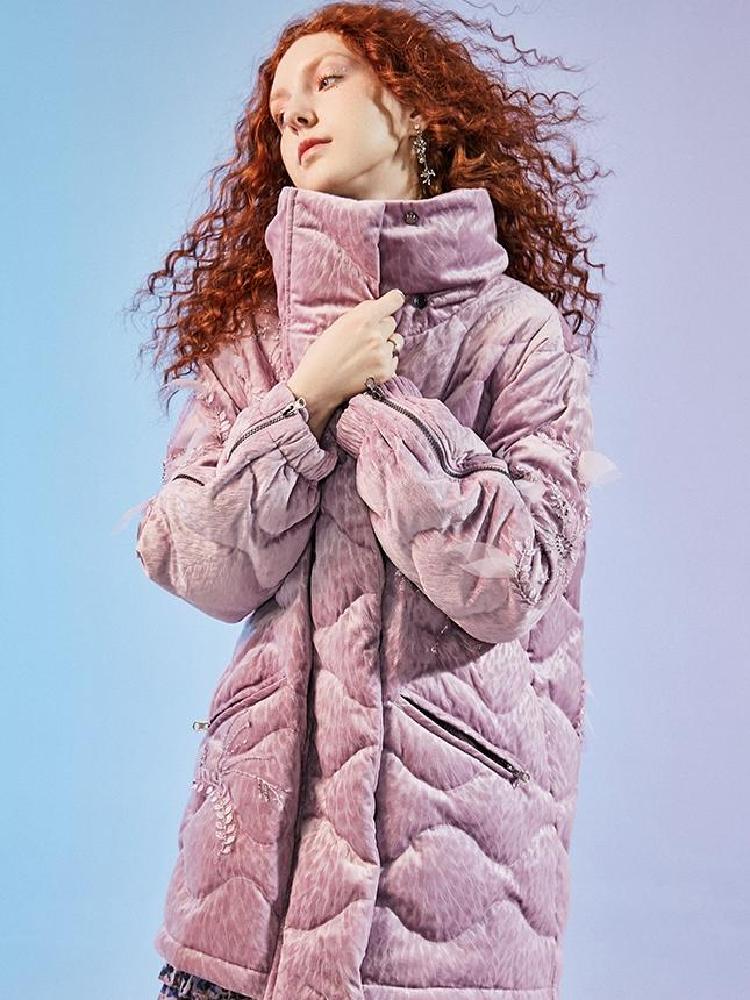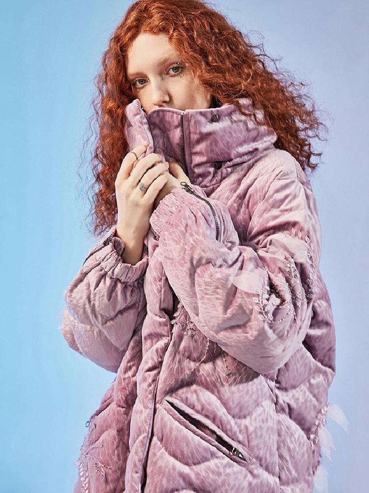 整体的款式设计,就如同是将棒球服做了加长加长,长到足以包裹你在严寒里取暖,再把羽绒服绣满了精致绣花。黑色的羽绒服上,精致的西域风绣花,充满了靓丽色彩,犹如一股来自西域的风吹来。