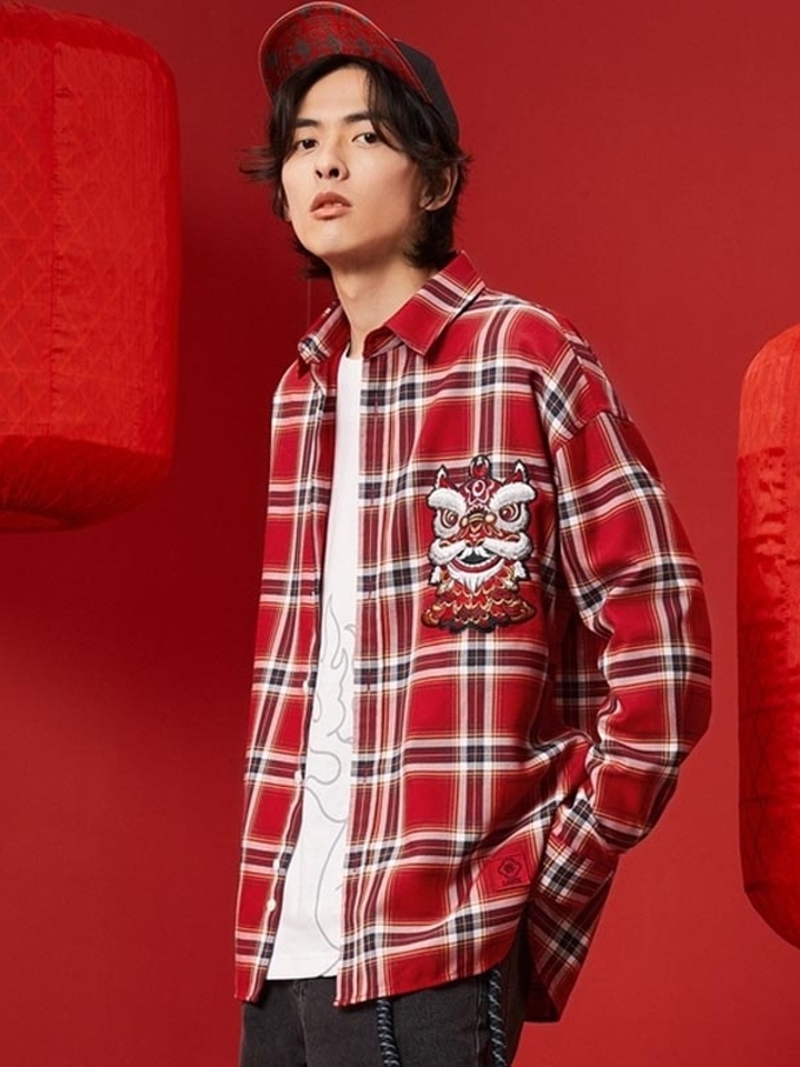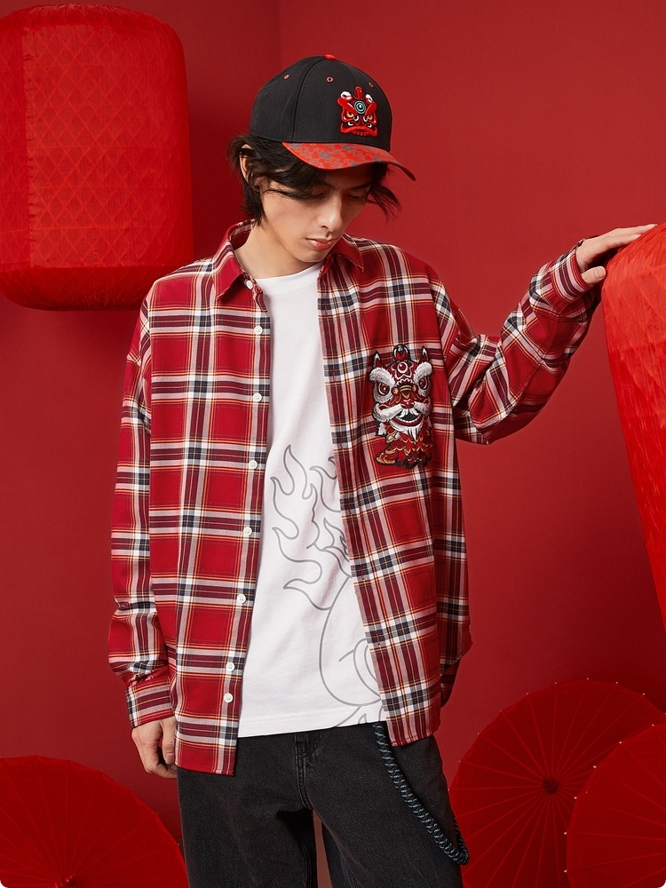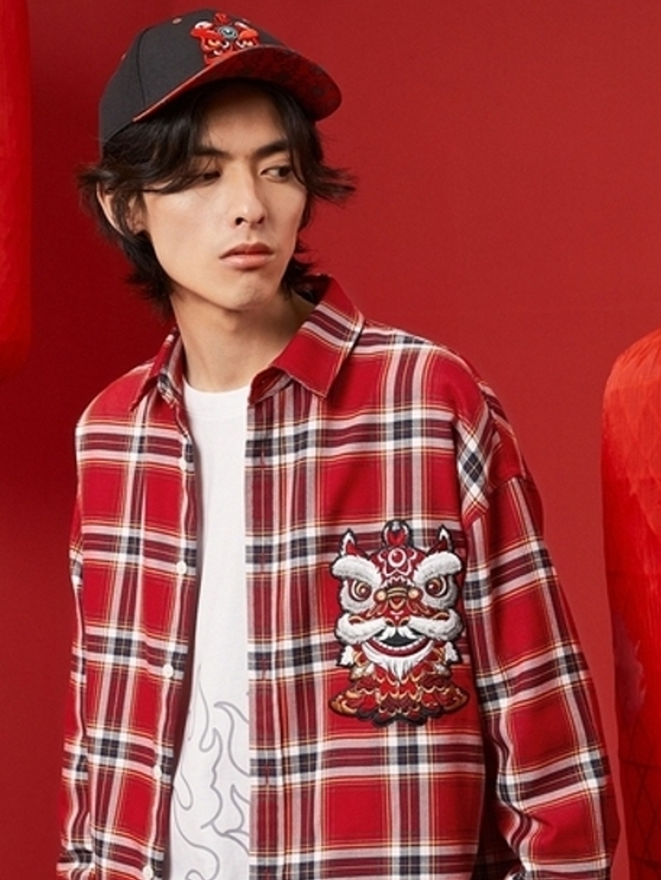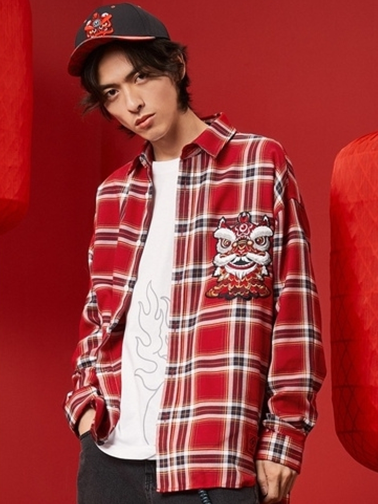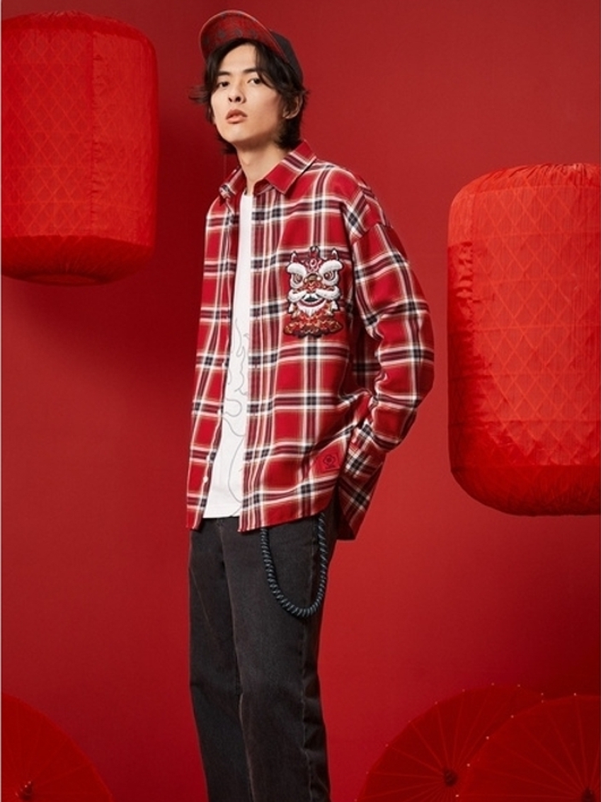红色撞色的格子衫,在灰压压的冬天来说,是装点街头的氛围,也是自带吸睛特质的存在。胸前的口袋附近,那生龙活虎的舞狮太有过年的氛围,喜气洋洋成就你的蓬荜生辉,今年冬天有点不一样。